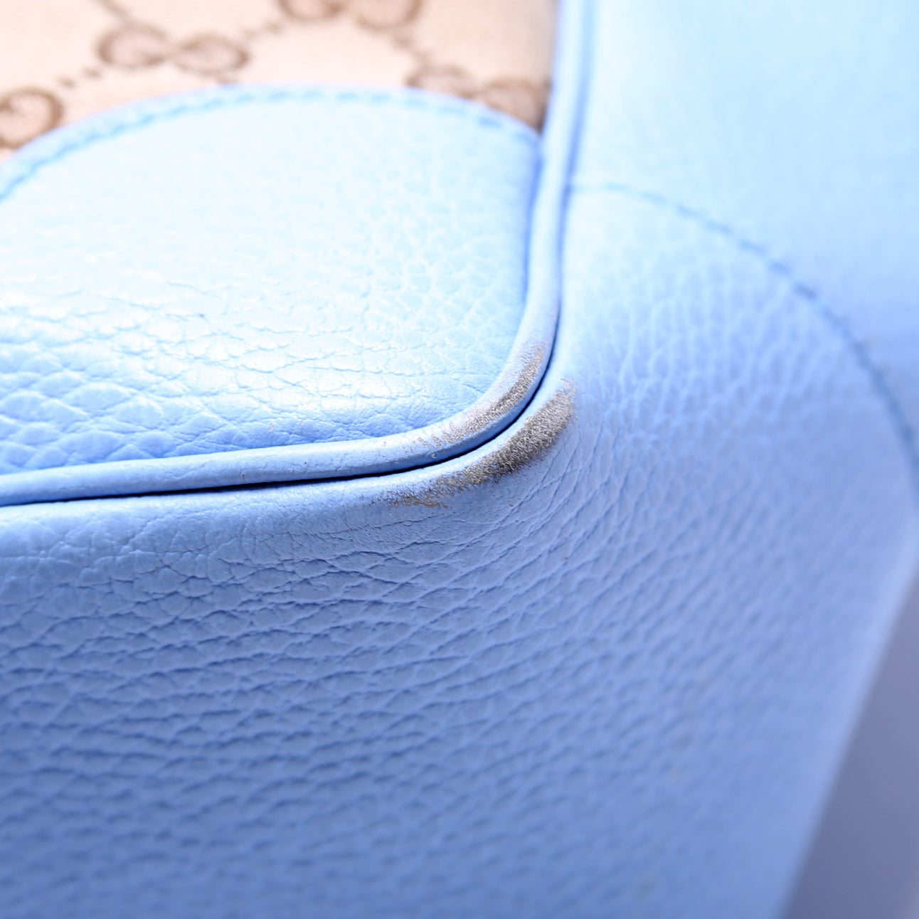 Exterior: The exterior canvas is free of any rips or cracks. The corners show heavy signs of rubbing, wear, and discoloration. The leather at the top shows wear, discoloration and rubbing.