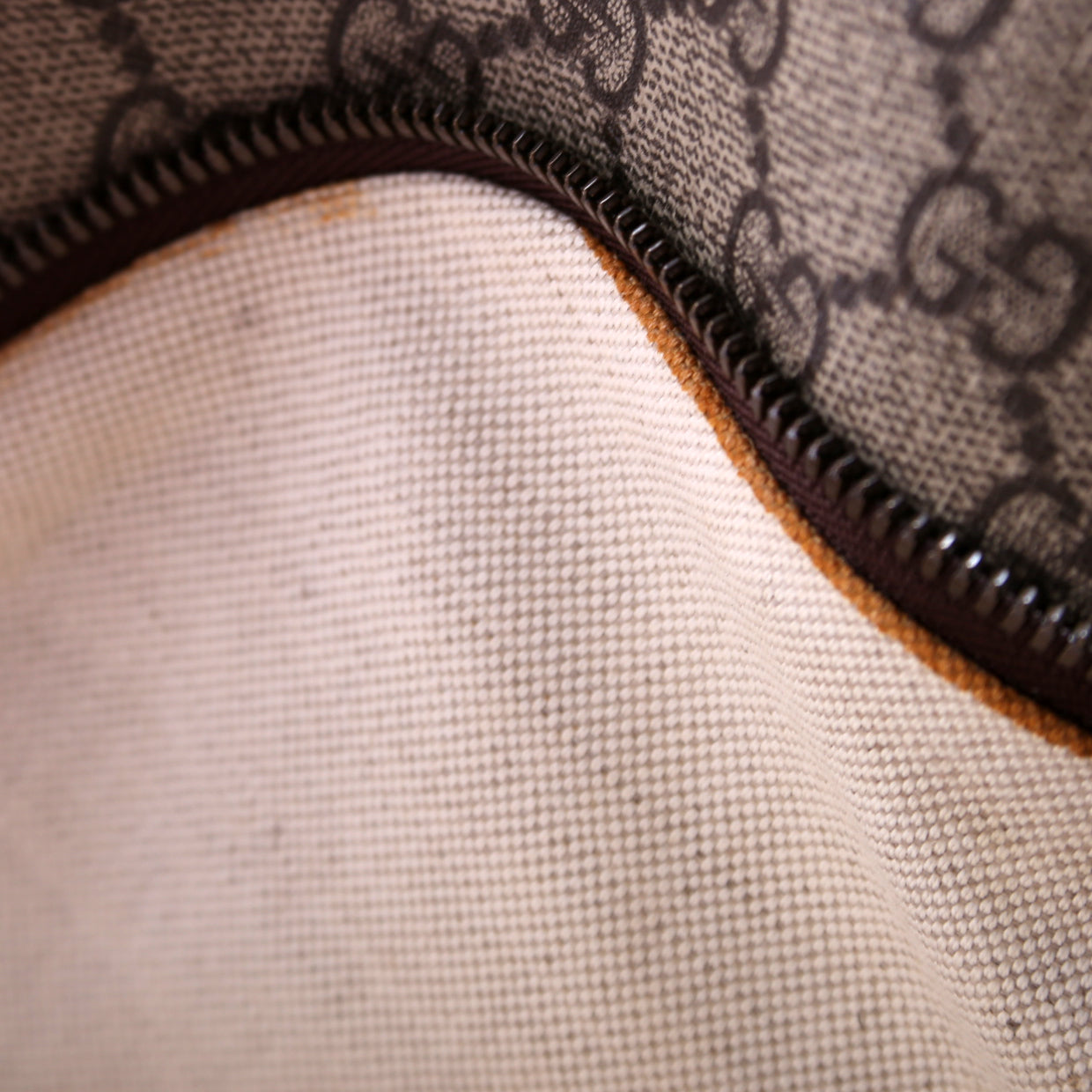 Interior: The interior is free of rips or tears. There is minor wear and discoloration throughout. The interior features two open pockets and one zip closure pocket.