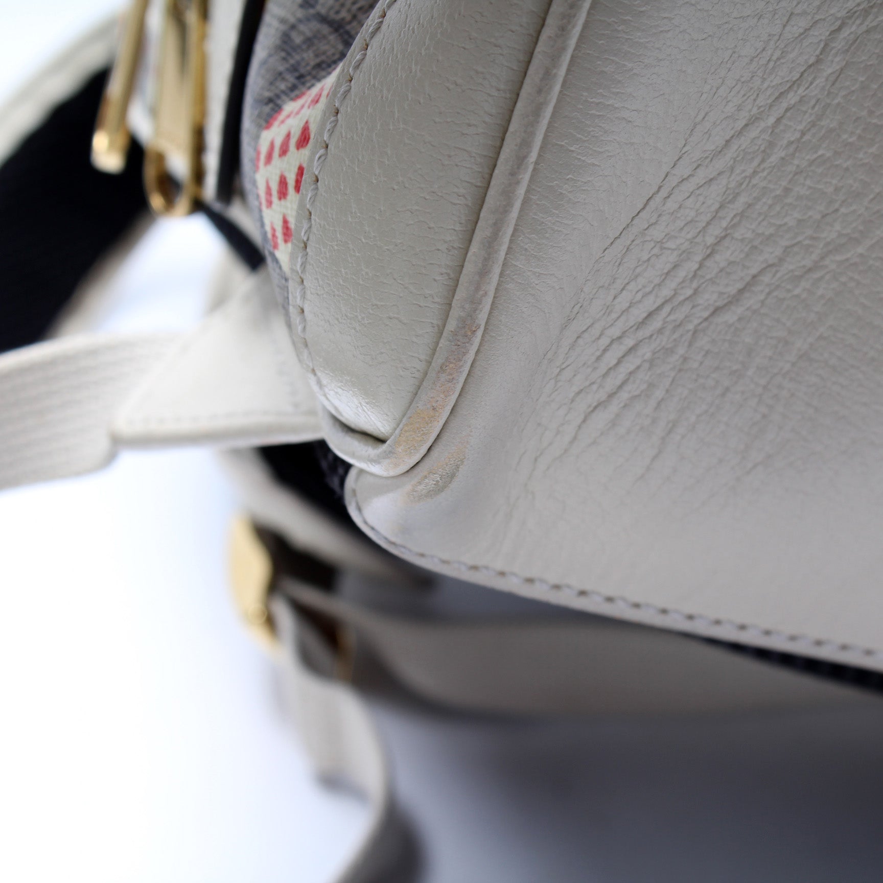 Exterior: The exterior is free of any rips or cracks, there are light scuffs. The leather trim and base shows minor scuffing. The corners show minor rubbing. The structure of the bag along the top is slightly misshapen due to storage.