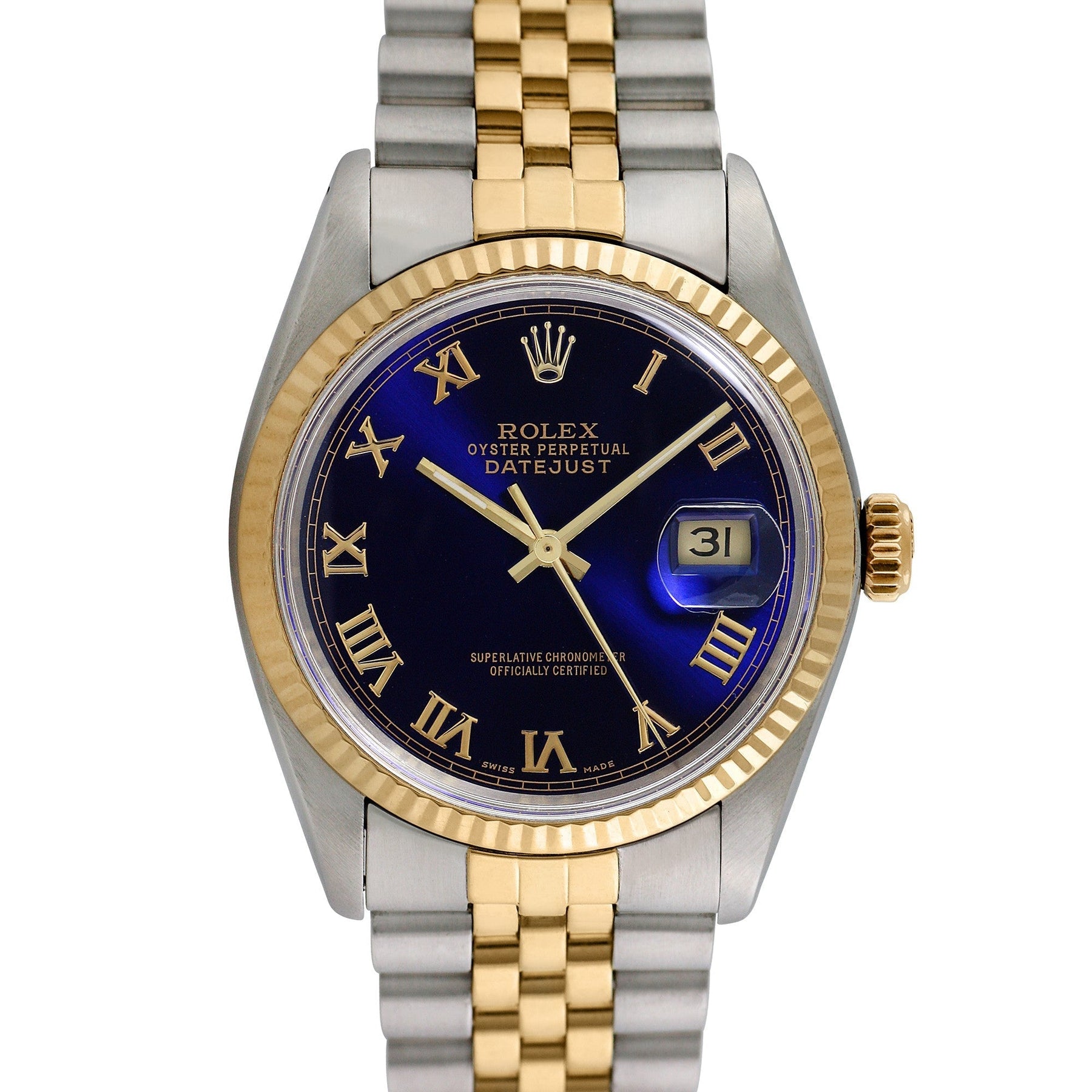 Stainless Steel case with a Stainless Steel and 18K Yellow Gold Jubilee bracelet and 18K Yellow Gold Fluted bezel. Blue (Refinished) dial with Roman markers. Automatic movement. Aftermarket Acrylic crystal. Screw down crown. Case size: 36mm. Band width: 20mm, band length: 7.5 inches. Deployment clasp. Water resistant at 100m Every Rolex watch comes packaged in a generic luxury box. Every Rolex Timepiece come with a 1-year limited warranty from the merchant and a Third-Party Certificate of ity.  Ruumur is an independent company. We are not an authorized dealer, nor are we affiliated with Rolex Watch USA. Rolex is a registered trademark of Rolex Watch U.S.A. and Rolex International. All Rolex watches come with all original parts.