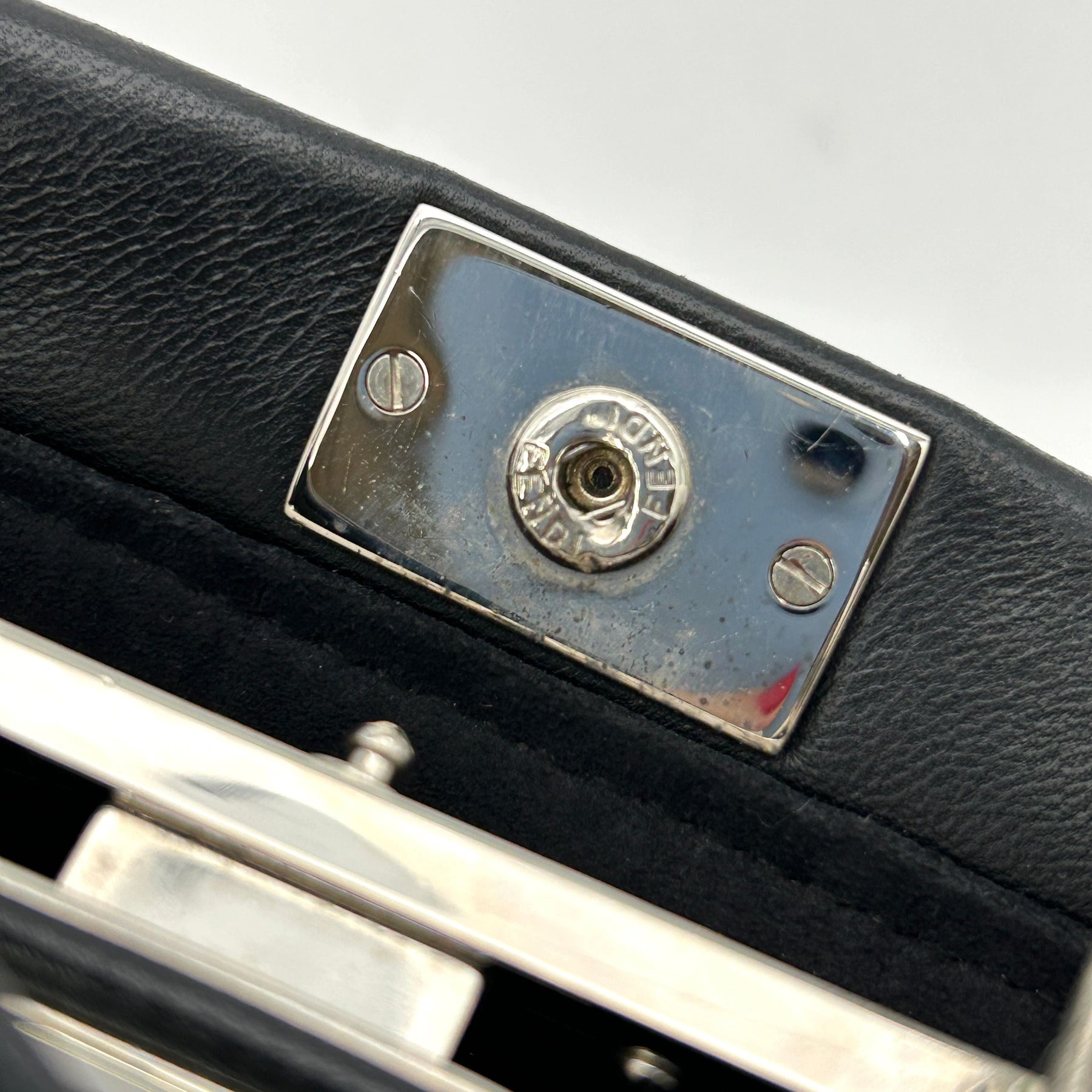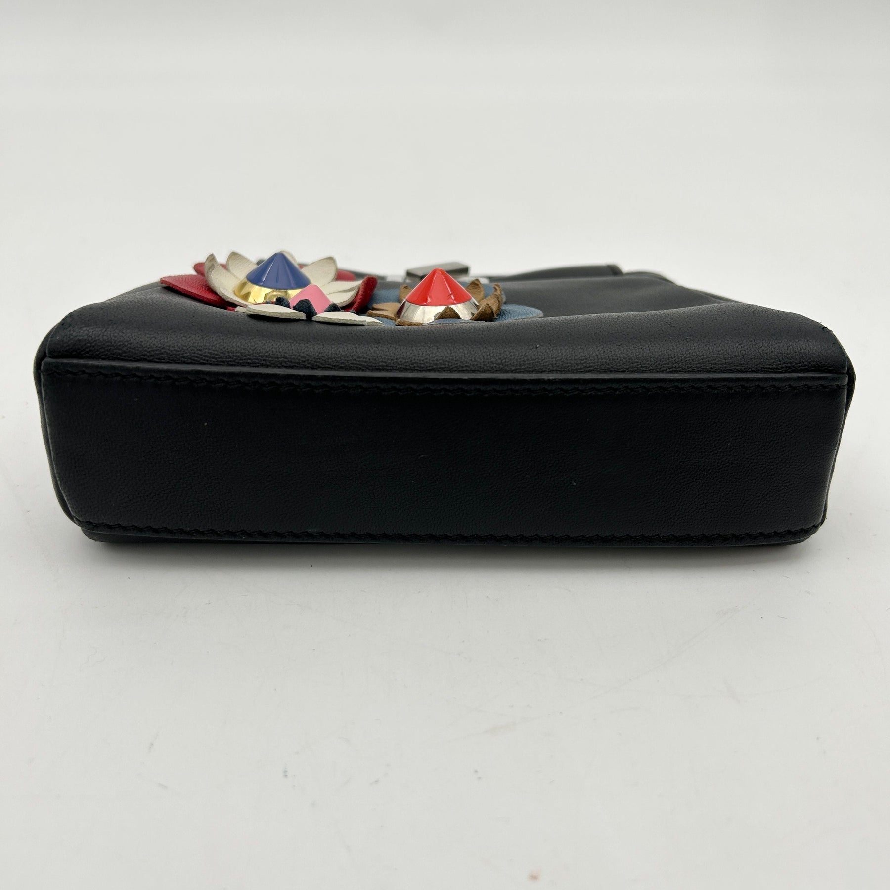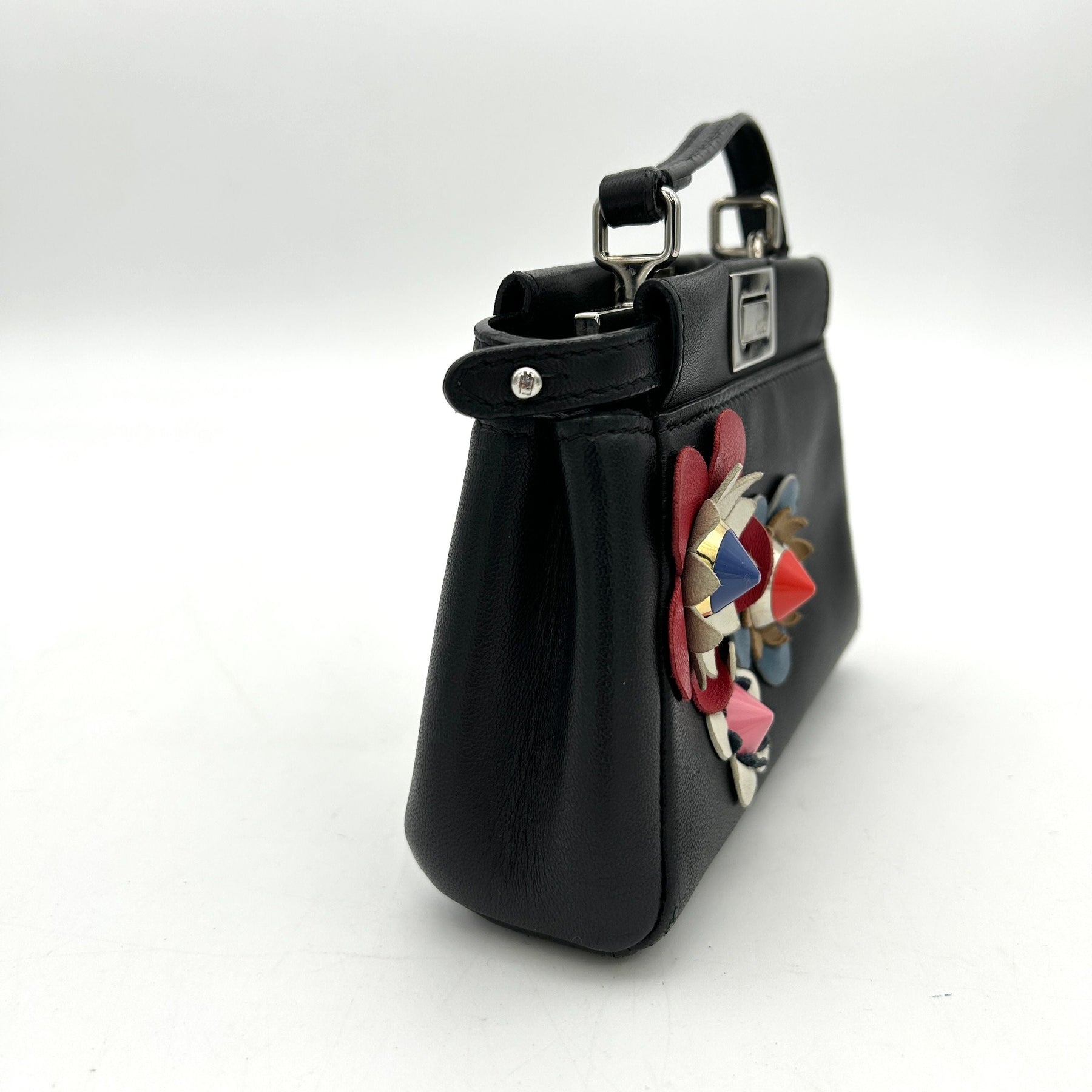 The FENDI Vintage Peekabo Micro Bag is a timeless piece that exudes elegance and sophistication. Crafted from black leather with exquisite flower details, this bag features a single flat top handle and a detachable shoulder strap for versatile styling. The dual interior compartments with grey suede lining and two card slots add practicality to its chic design. Perfect for any occasion, this bag is a must-have for fashion enthusiasts. |