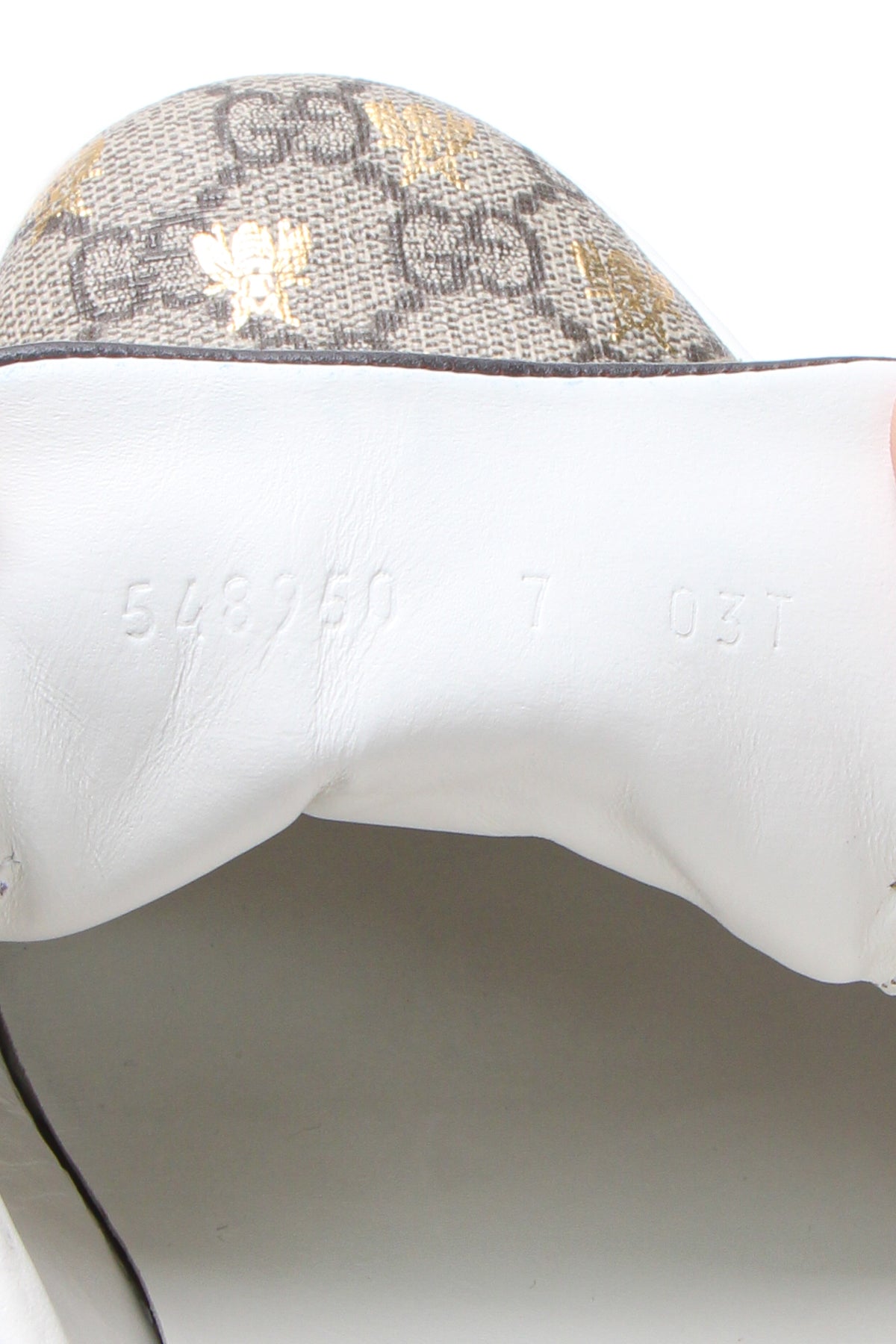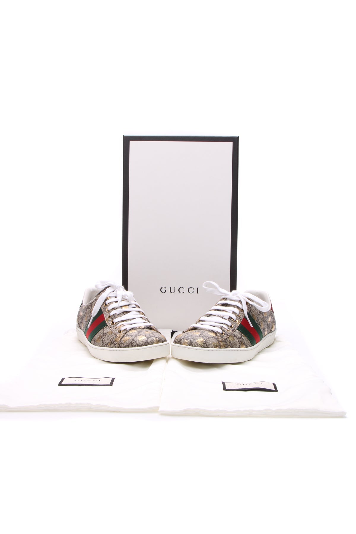 Showcasing the interesting and fun designs Gucci is known for with these authentic Ace sneakers. Supreme canvas, gold-tone bee print, web stripes, and snakeskin on the heels all come together in this classic casual pair!