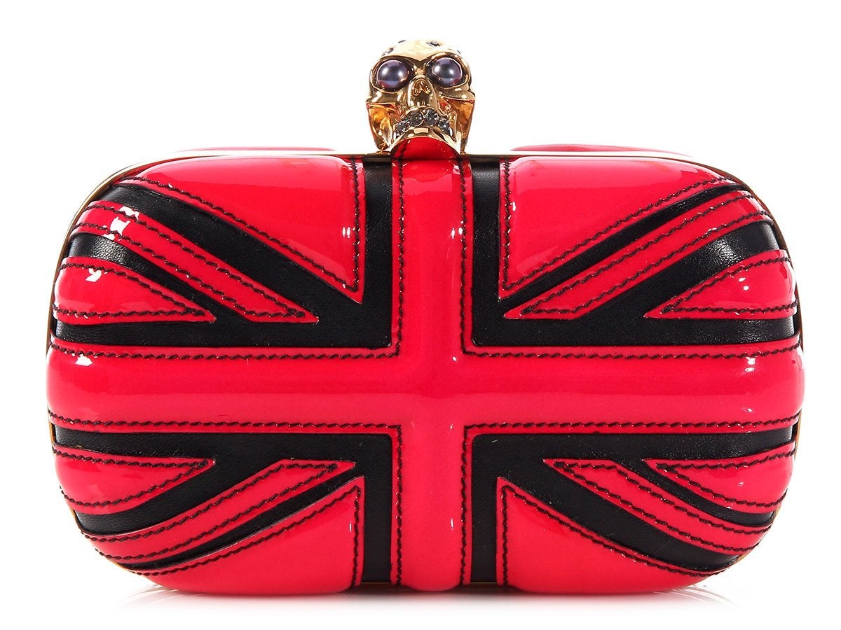 Alexander McQueen’s Red and Black Union Jack Clutch packs a lot of sass into a small space! Made of red patent leather with black leather and black stitching laid out to make a Union Jack design, it’s a box clutch with a gold frame. The clasp is a skull with gray rhinestones on top and for teeth and purple pearls for eyes, opening to a black leather lining inside. Coming with a dustbag, the hardware and inside have wear. Rock and roll style!