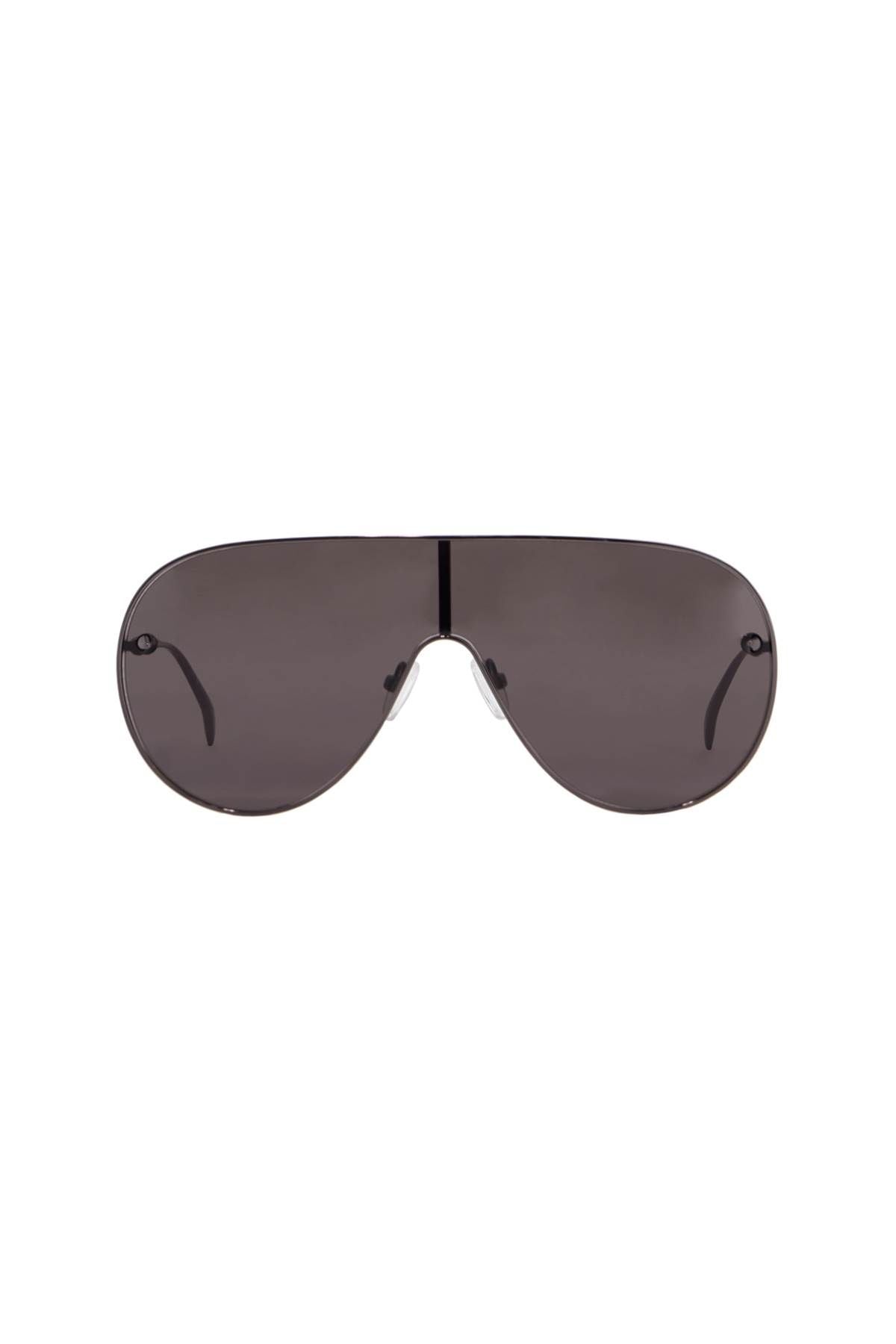 Alexander McQueen metal aviator sunglasses with ruthenium finish and studded detailing on the dark lenses. Signature engraved on the frame, 100% UV protection. Protective case included.