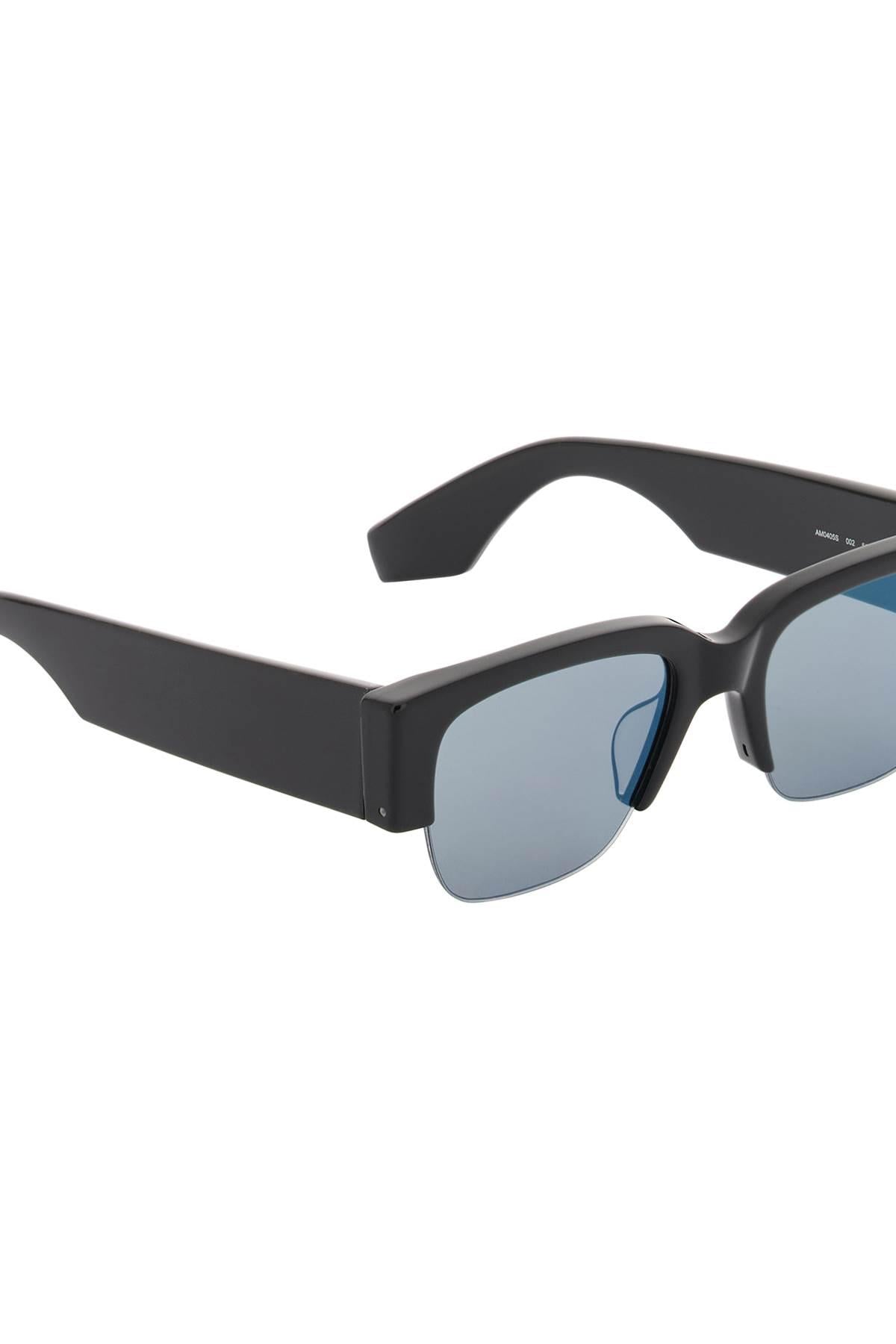 Acetate sunglasses by Alexander McQueen in square shape with a half-rim frame with mirrored lenses and contrasting Graffiti lettering logo on the left temple. Protective case included.