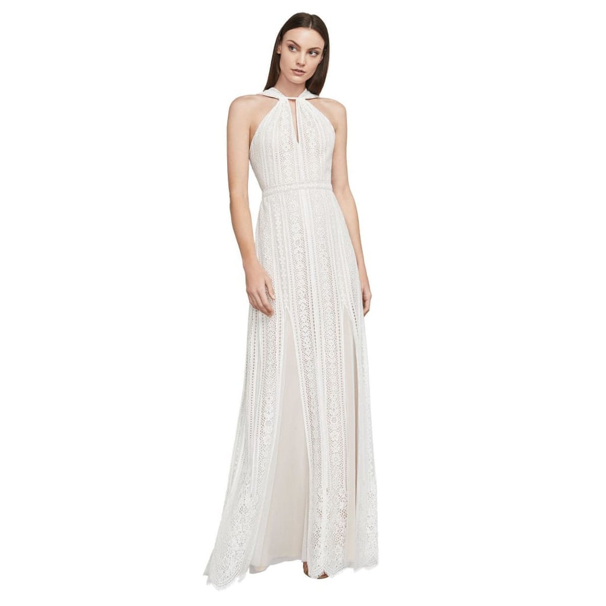 Timeless elegance is yours in this sleeveless halter creation crafted from scallop lace and embellished with tulle inserts at the flowing godet hemline