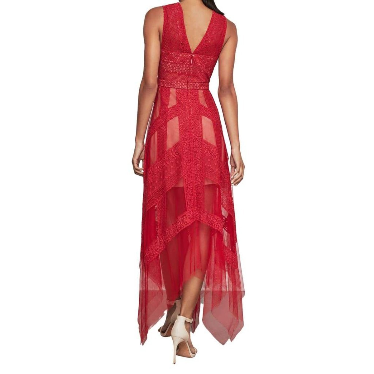 Crafted from geometric and floral striped lace, this sleeveless dress falls to an asymmetric hemline and features semi-sheer panels for an alluring finish.