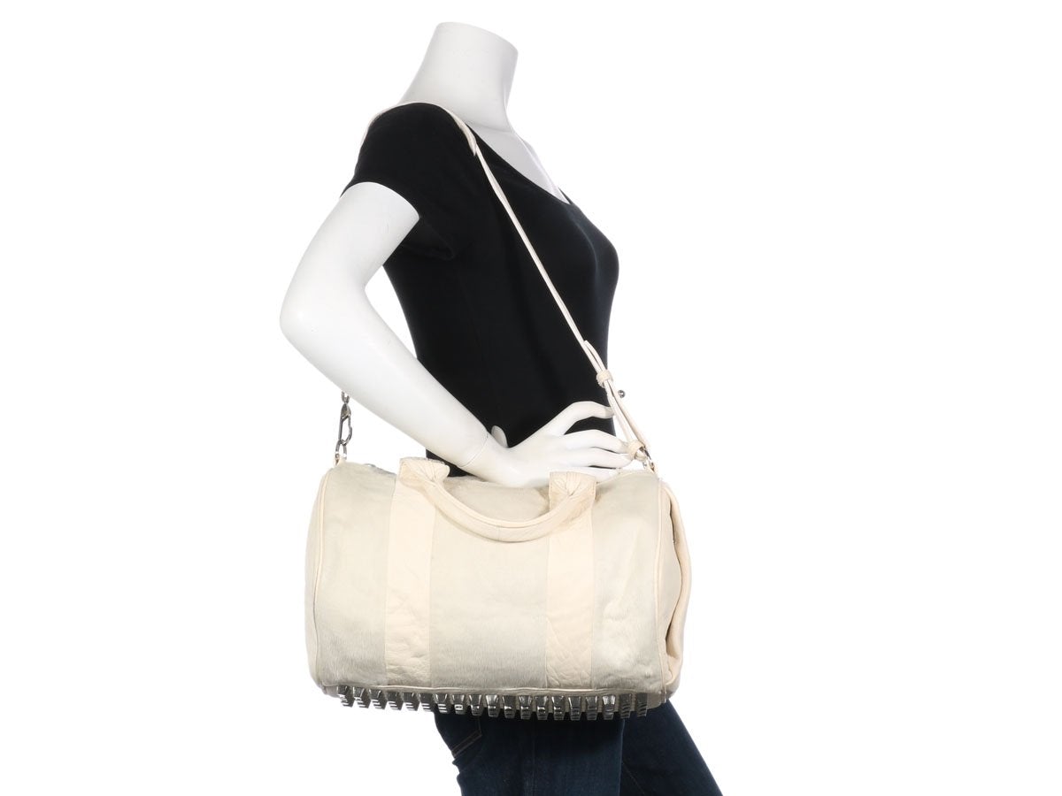 The whole bottom of Alexander Wang’s White Pony Hair Rocco is covered in silver studs while the rest of the bag is white pony hair with off-white crinkly leather trim – what a bag! Coming with a dustbag and shoulder strap, there is wear on the edges, corners, shoulder strap, hardware, handles, and bottom, as well as glue marks, a small dark mark, some of the hair has rubbed off a bit, and it has some weight to it. Under the four inch drop to the handles, a silver zipper opens the top to a gray fabric lining with one zipped and two slide pockets inside. This is one amazing bag!