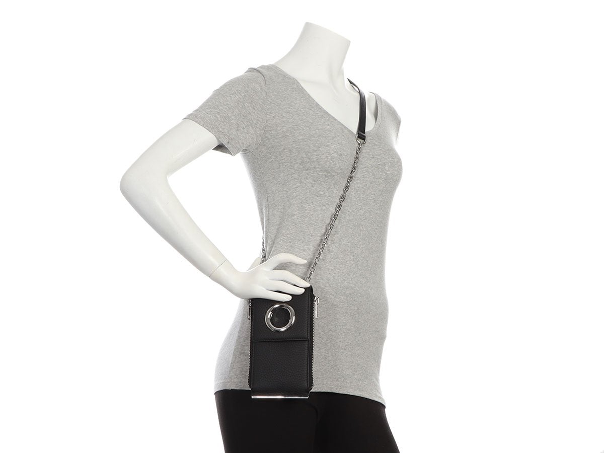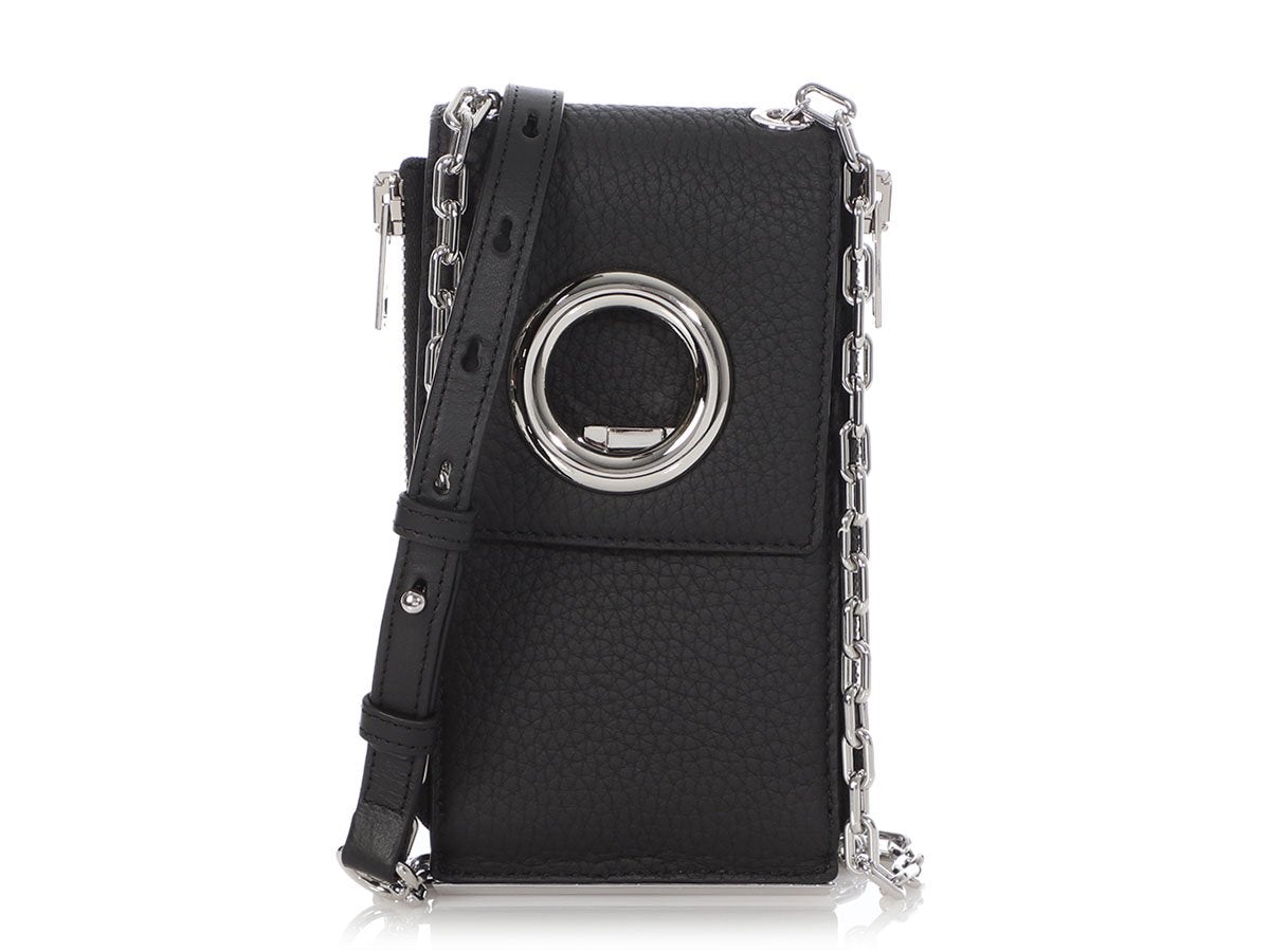 This Alexander Wang Black Riot Wallet on a Chain is a crossbody wallet made of black pebbled leather with silver-tone hardware! A true wallet on a chain-plus-leather strap with a 22-inch drop, it has a flap with a metal O embellishment and a cell-phone slide pocket under it. There is a zipped pocket on each exterior side. The one on the right expands to reveal two slide pockets and one zipped pocket, while the one on the left side expands to reveal 10 card slots all lined in black leather. When you want to palm this deceptively roomy wallet, simply remove the strap. In excellent condition with a box, it has scratches on the metal circle clasp. And when you want to read them the Riot act, simply flash this crossbody wallet!