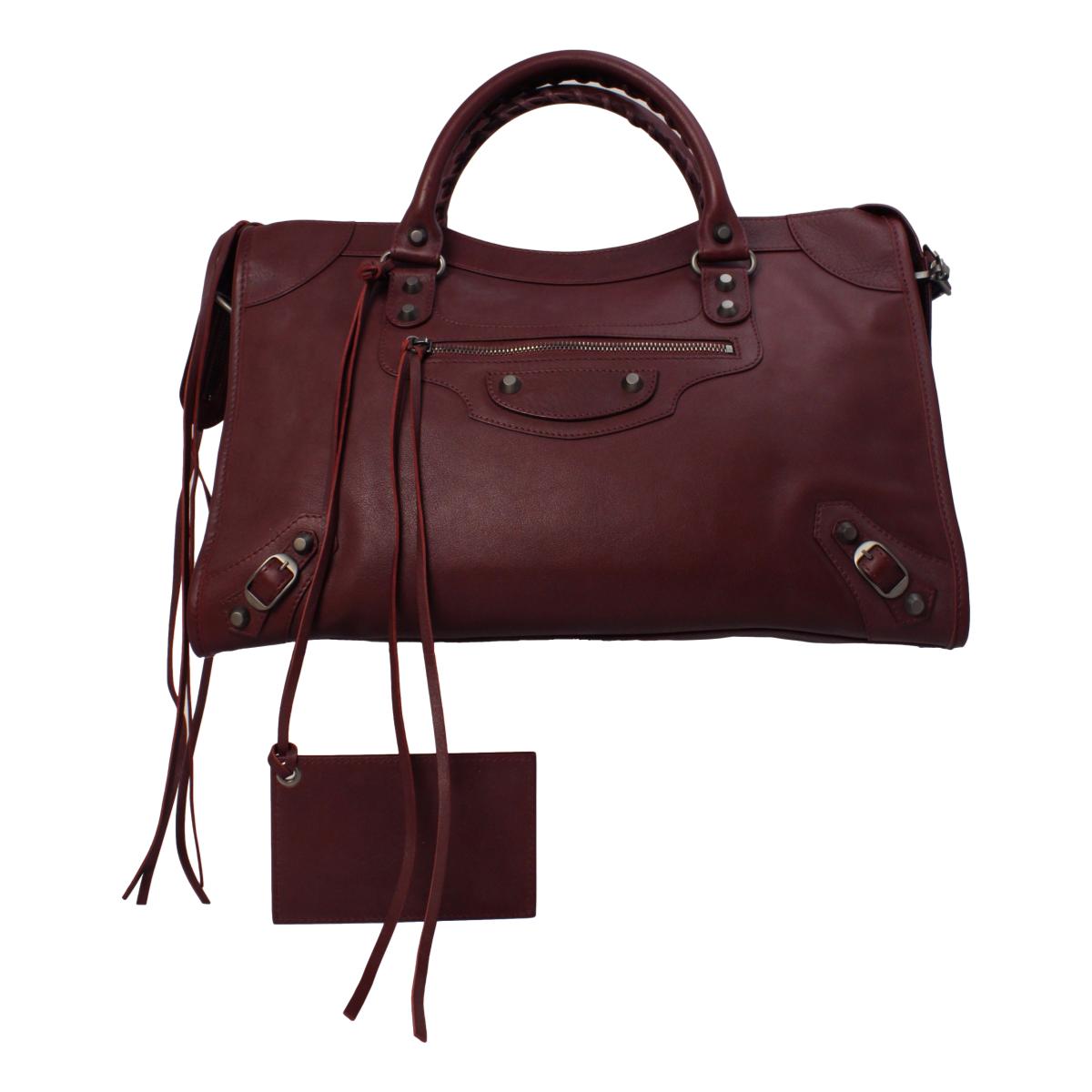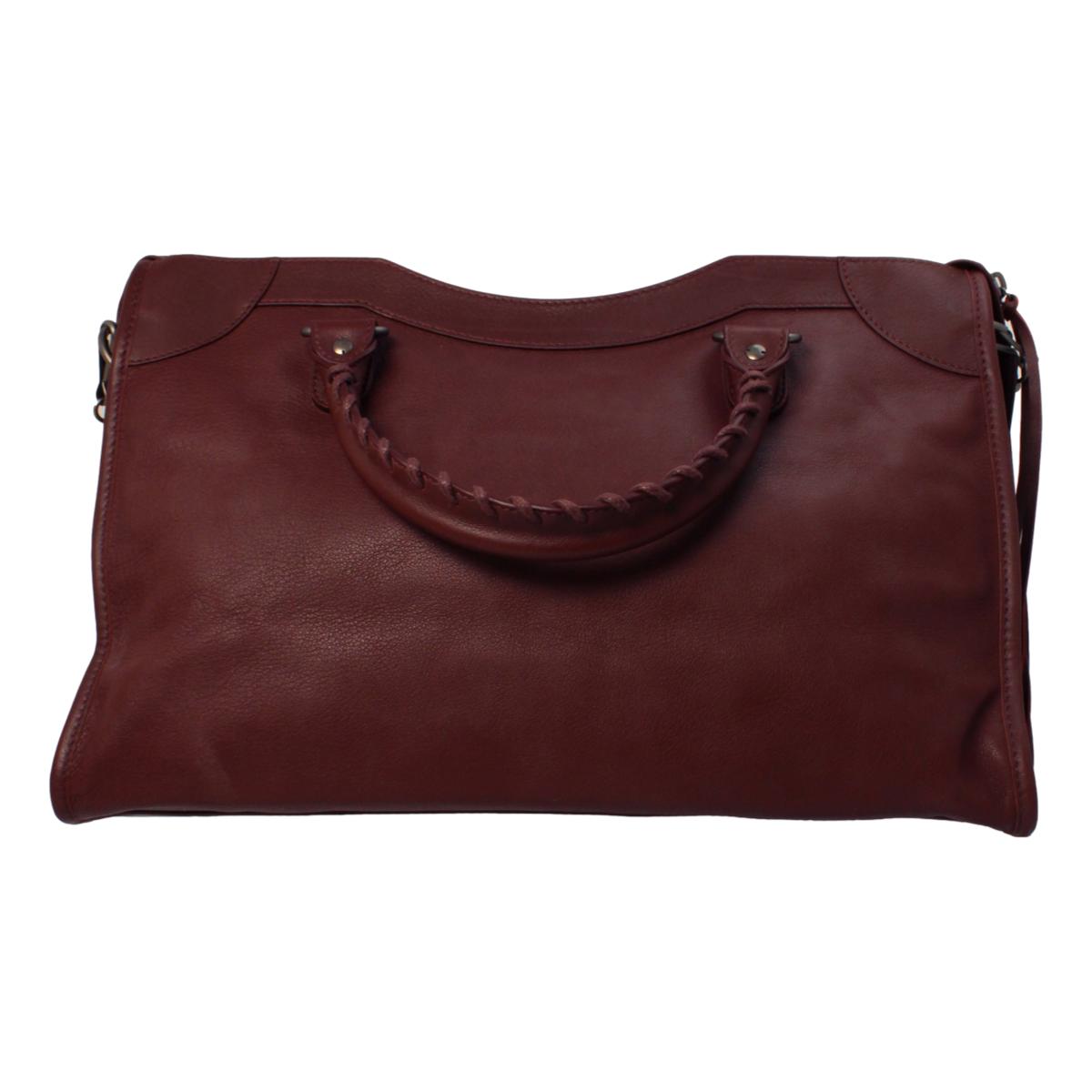 This chic tote is crafted from leather in a beautiful Bordeaux red color. The bag features whipstitched rolled leather top handles and an detachable shoulder strap. The face of the bag is embellished with a zipper pocket and gold-tone hardware. The top zipper opens to a spacious leather interior with a zipper and slip pockets. This is an excellent handbag, ideal for everyday use, with the distinctive style of Balenciaga!