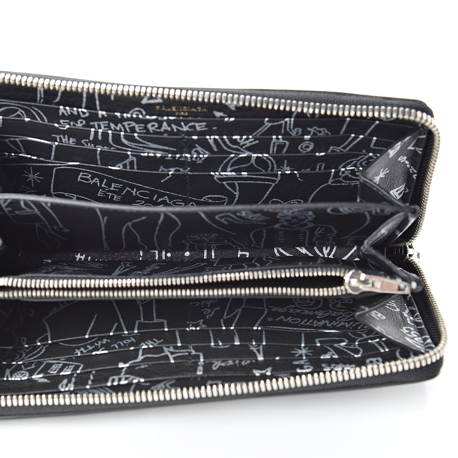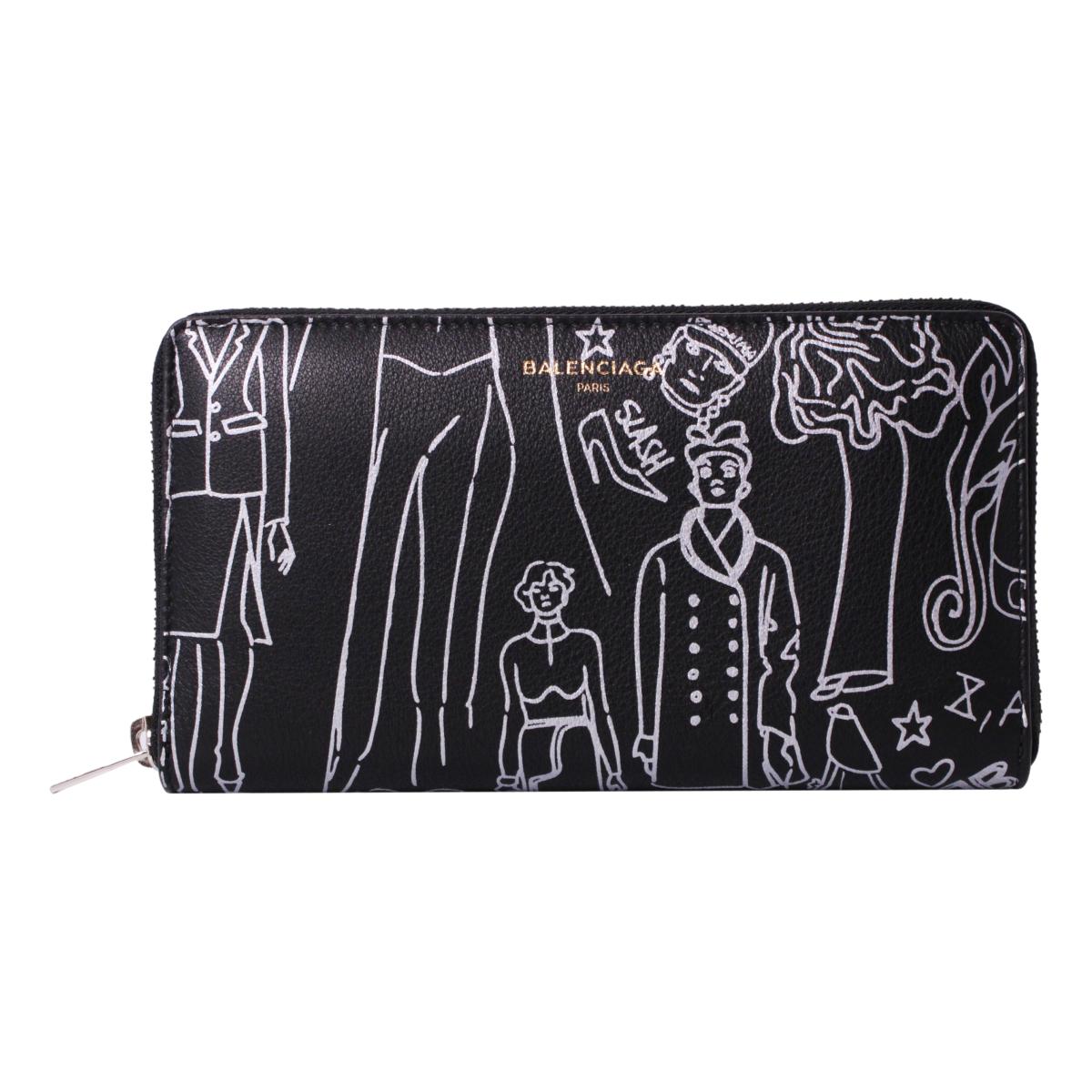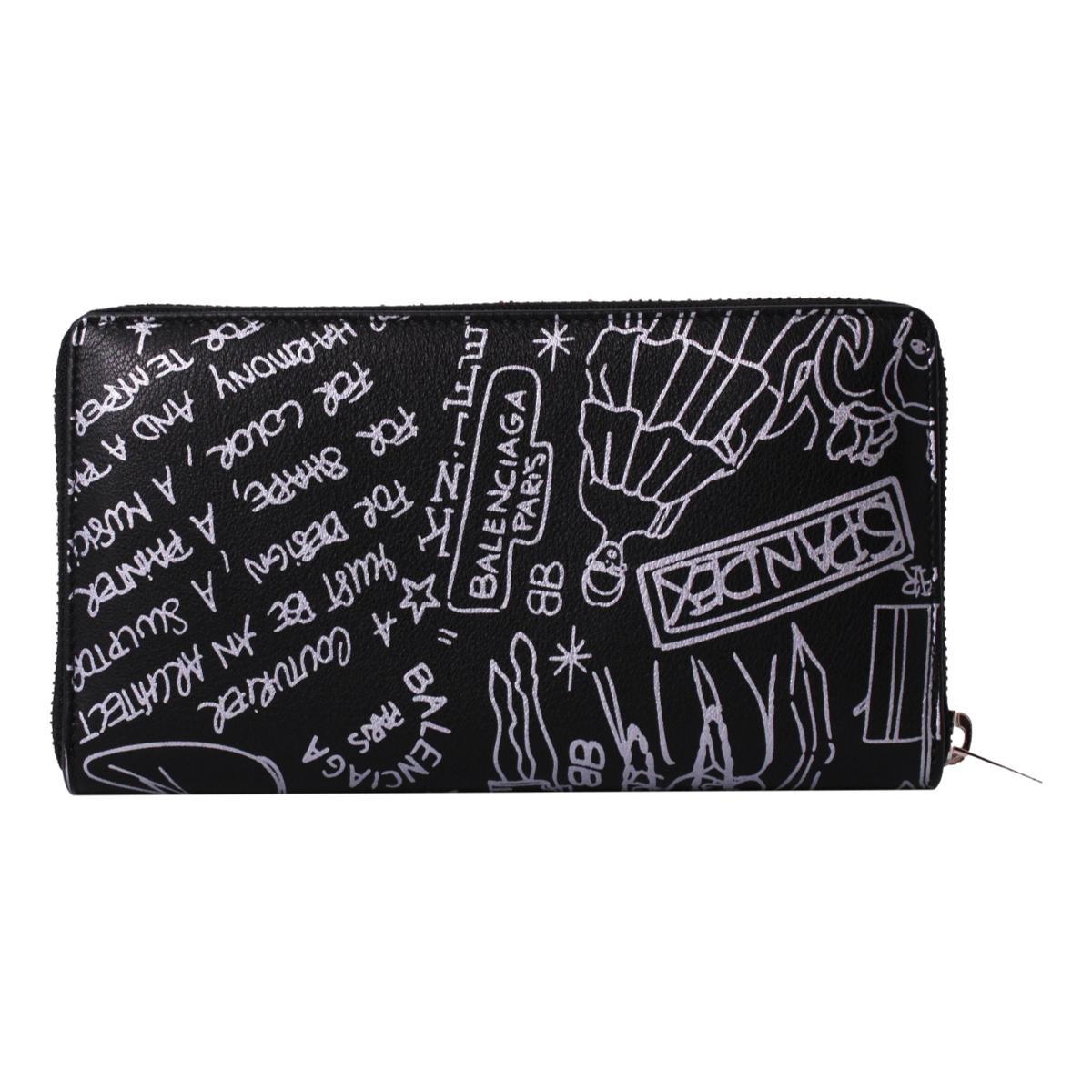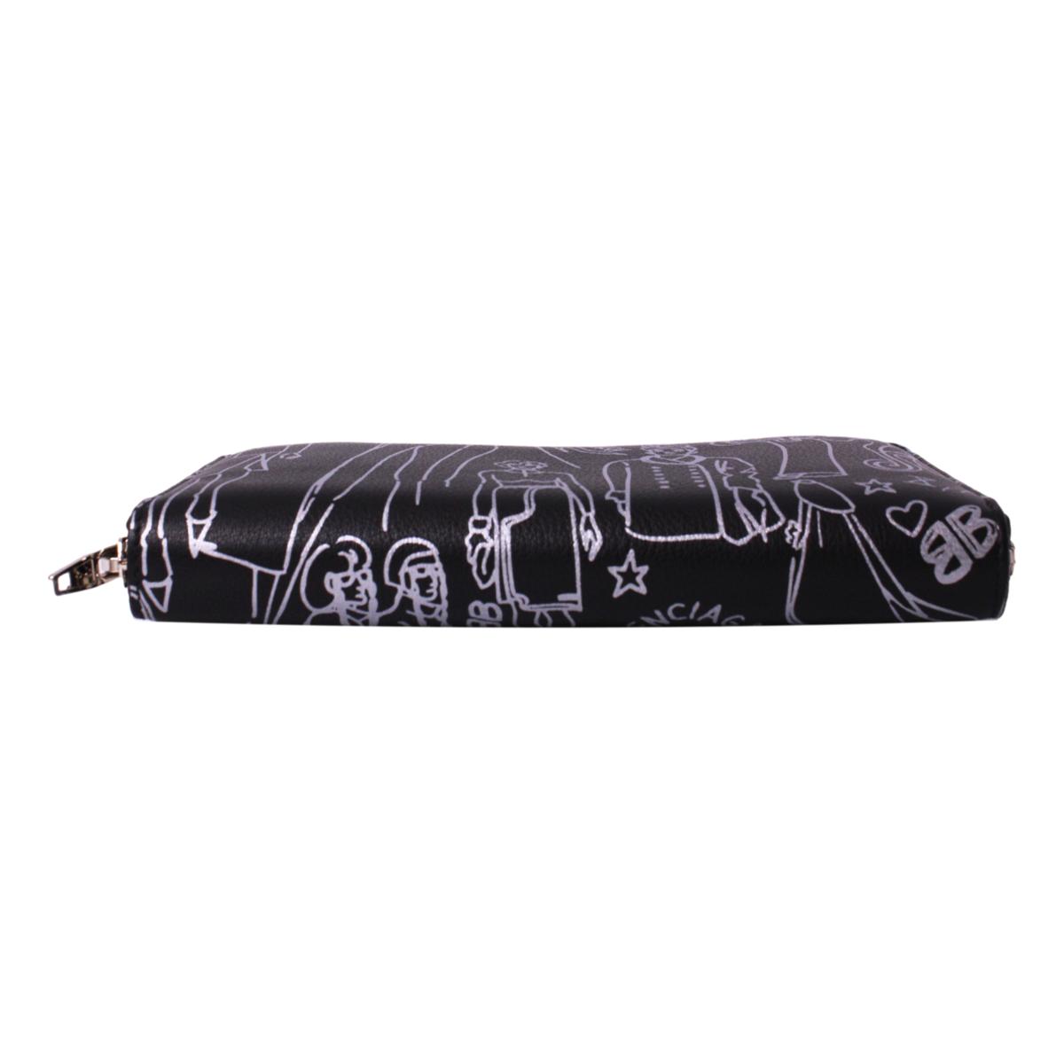 This stylish wallet is crafted of calfskin leather in black, with a decorative tattoo print in silver. The wrap-around zipper opens to a partitioned matching silver printed black leather interior with card slots, a central zipper compartment, and bill slots. This is a stunning wallet for everyday, with the bold sophistication of Balenciaga!