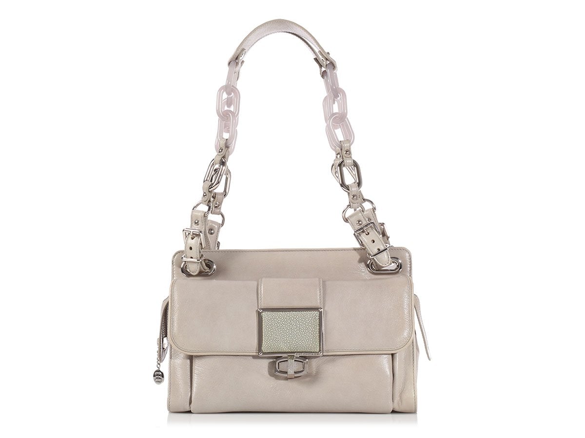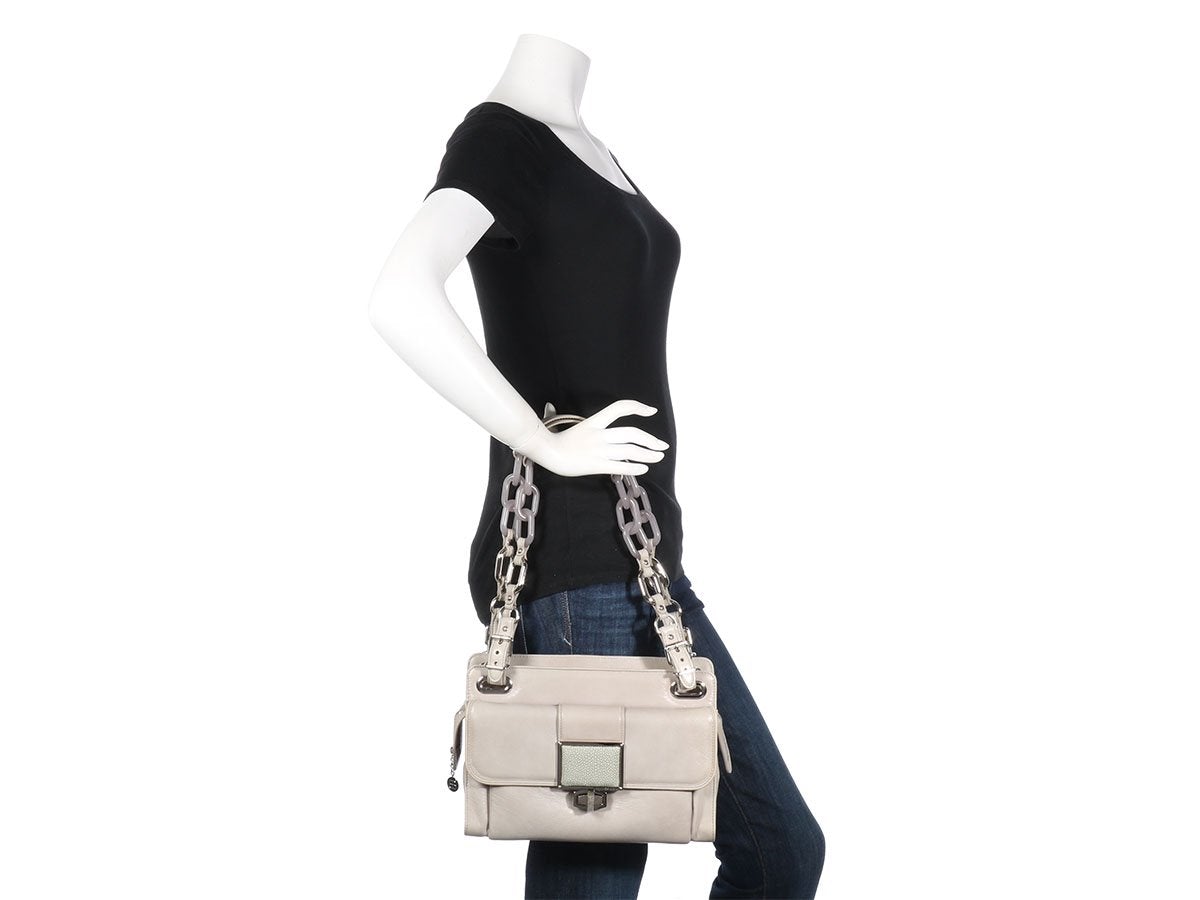 Shown here with an eleven inch drop, Balenciaga’s Gray Cherche Midi Satchel has fancy adjustable straps of semi-transparent gray resin and silver links with gray leather pads at the top! Coming with a dustbag and mirror, there is wear on the corners, edges, hardware, and on the front, as well as some marks on the front.  Open the zipper on top to the black fabric lining with a zipped pocket inside, while the front has a turn lock on the flap pocket and the back has a zipped pocket.  The light gray leather bag has a light beige stingray square on the front to give your fingers a thrill!