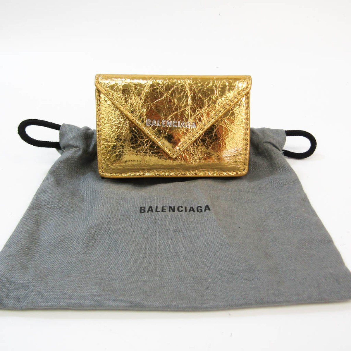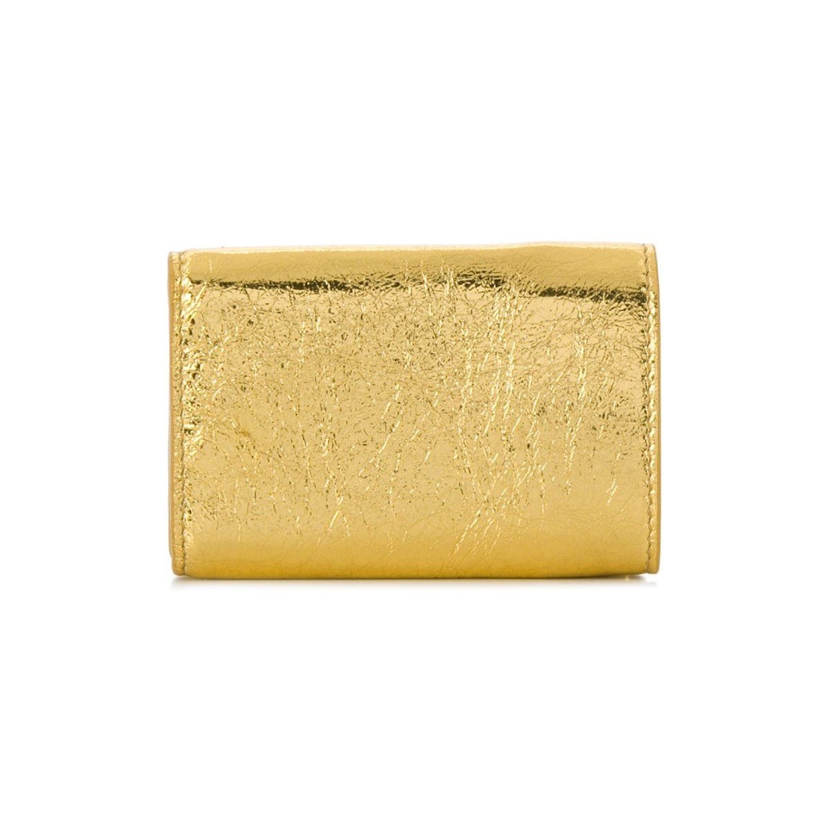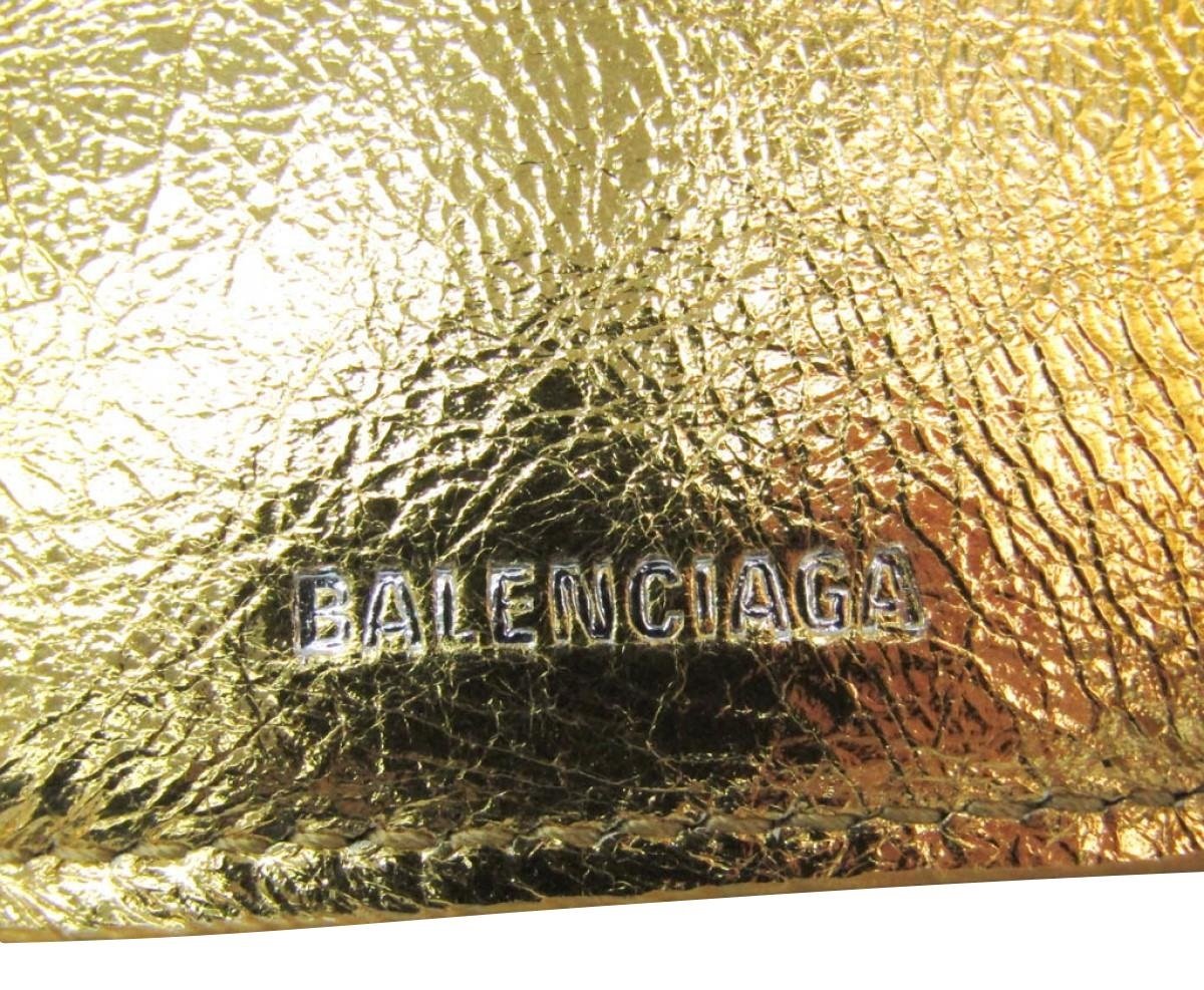 This trifold wallet from Balenciaga is not only fun, but function. This wallet is crafted out of beautiful soft lambskin leather. The exterior has bright beautiful metallic gold leather while the interior is lined with black fabric. The front of the wallet features the iconic Balenciaga logo in metallic gold. On inside of the wallet there is a bill slot, three card slots, along with a coin pouch.