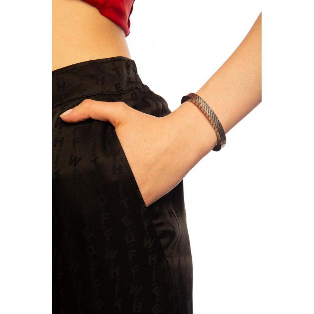 This gorgeous Balenciaga evening bracelet is the perfect accessory to dress up any outfit. It is crafted out of beautiful silver-tone brass and features the iconic Balenciaga logo all over the bracelet.