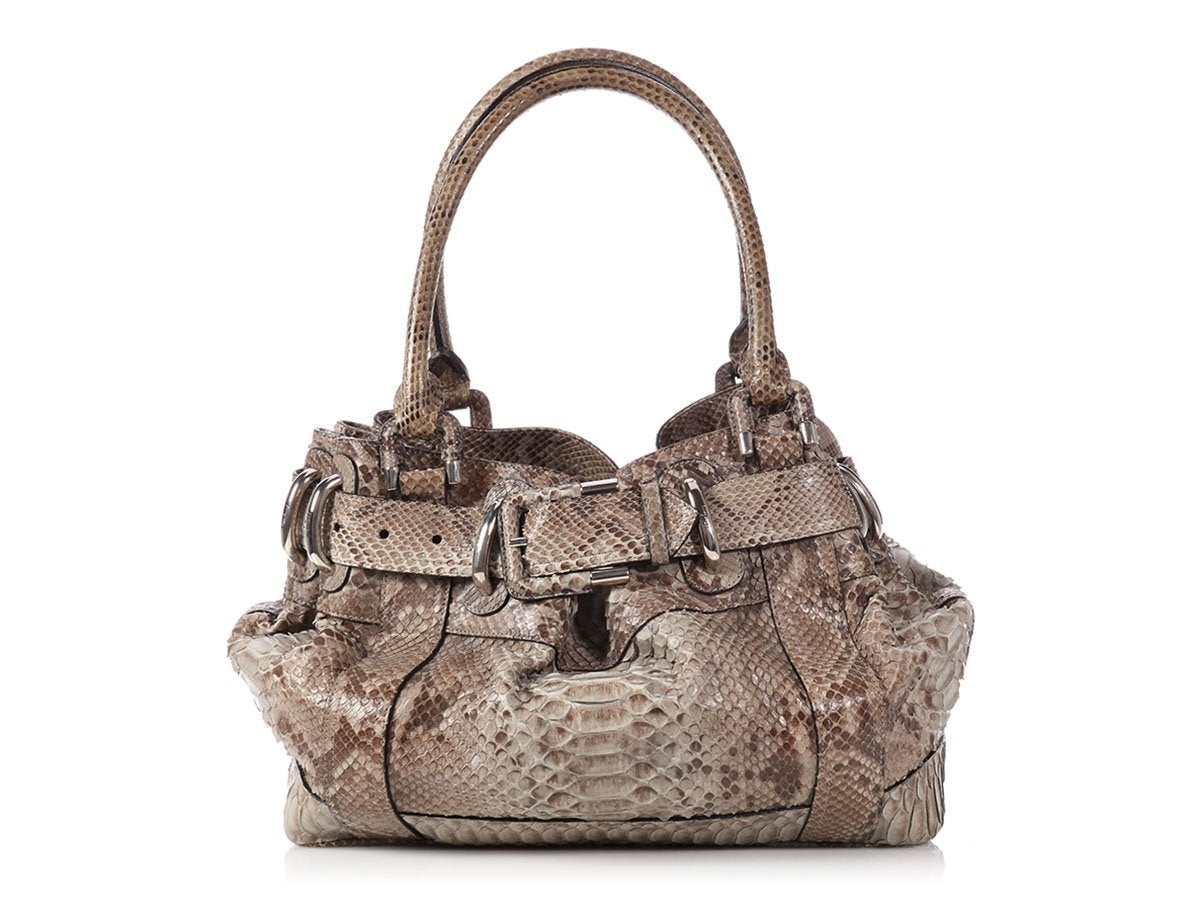 This large Burberry Beaton Bag is made of woven python that changes in color from tan to ecru to white depending on the light! It has belt-and-buckle detailing that is threaded through silver-tone rings at the top and sides giving it a devil-may-care slouchy look despite the five feet that lend some structure. The unsecured top opens to gray satin lining with one zipped pocket, one slide pocket, and a center zipped section to keep your contents from fighting with each other. The dual rolled python skin handles have a drop of 9 inches, which could be snaked (ouch!) up to the shoulder. In excellent condition, one end slouches in more than the other. This Beaton has some weight to it when empty, but that’s a small sacrifice to pay to have this beauty by your side!