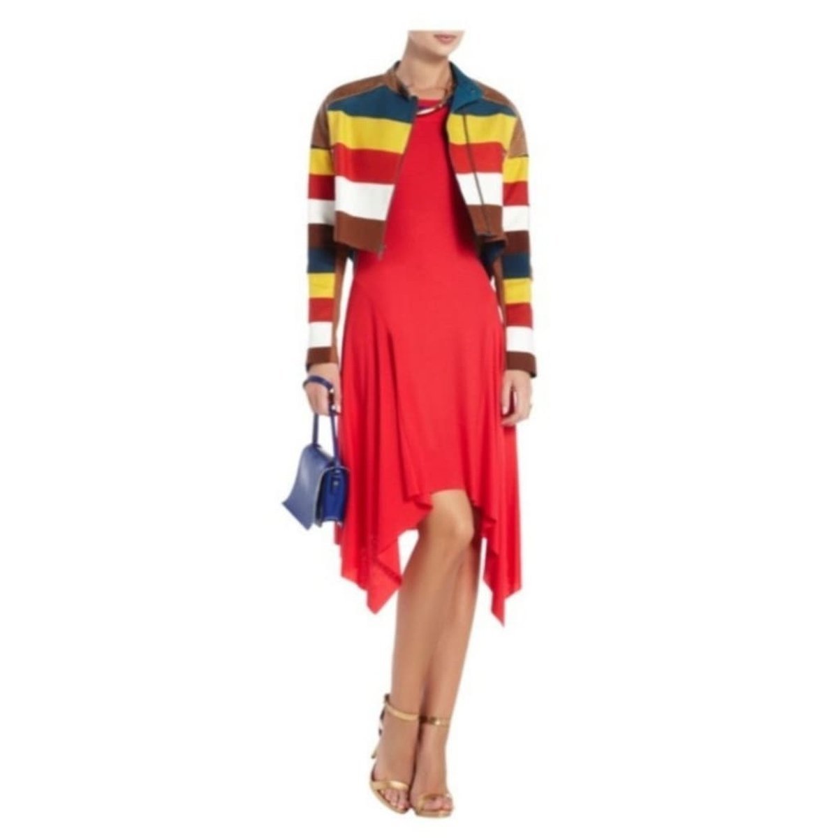 Features an off-the-shoulder neckline and three-quarter length sleeves.