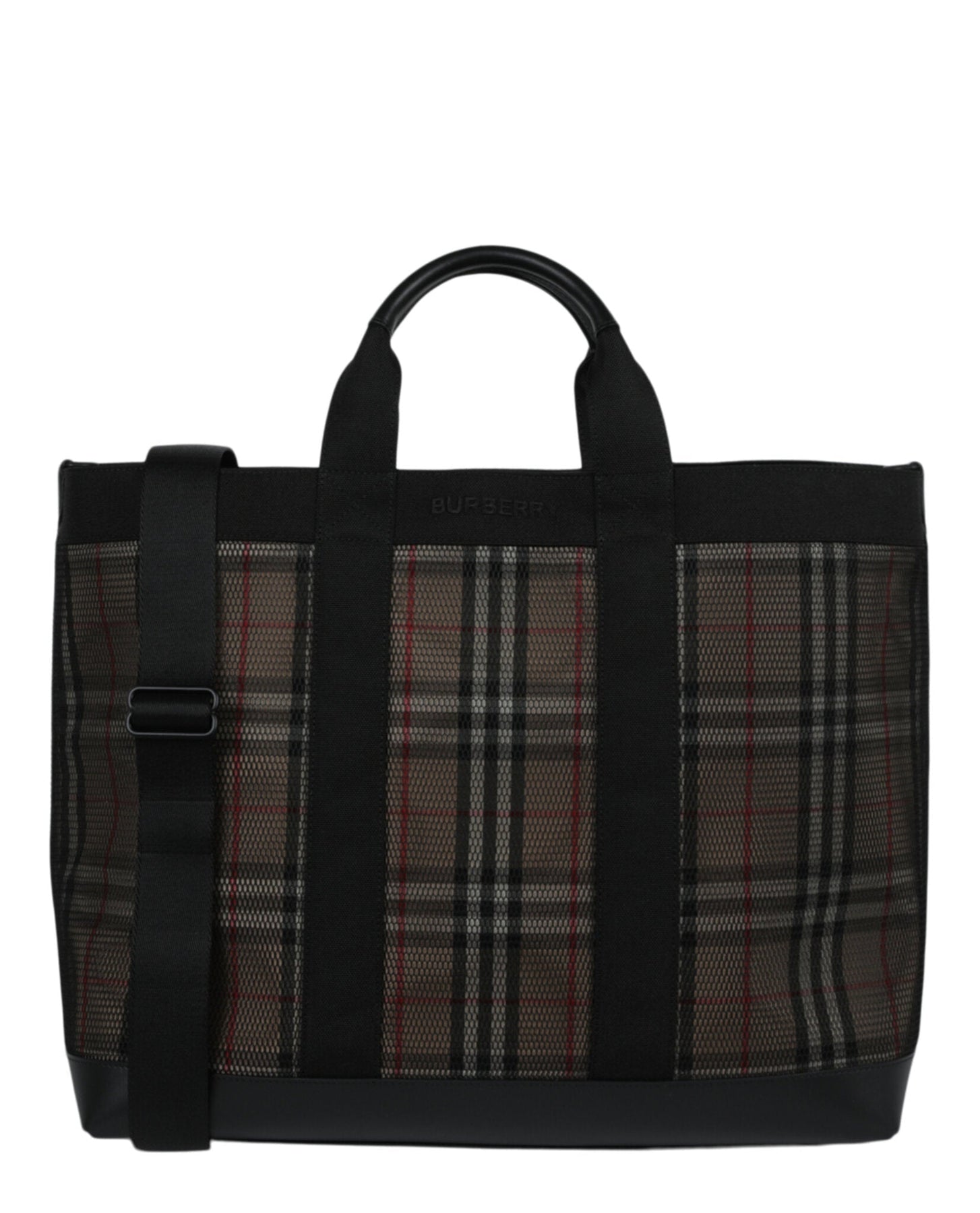 Length: 16.5" x Width: 7" x Height: 14"; Strap drop: 19"; Handle drop: 4.5" | Open top | One interior zip pocket and two slip pockets | All over check print with a mesh overlay;Two top handles; One shoulder shoulder strap | Specialist clean only | 55% Cotton, 45% Polyester | Made in Italy