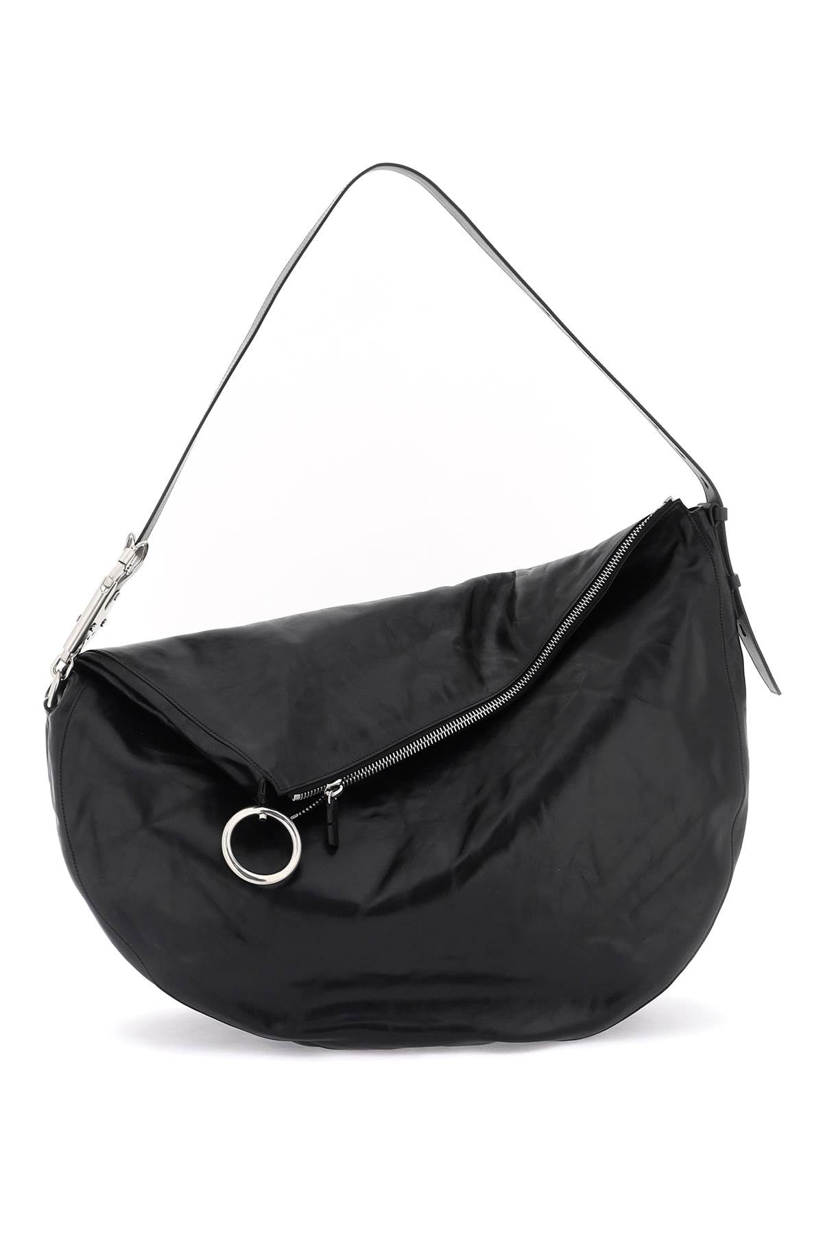 Knight bag by Burberry crafted in grained leather, characterized by a soft texture and embellished with horse-shaped snap hook. Top zipper closure, contrasting suede interior with an open, removable and adjustable shoulder strap. Finished with hand-painted edges and maxi ring. Silver-finished metalware.