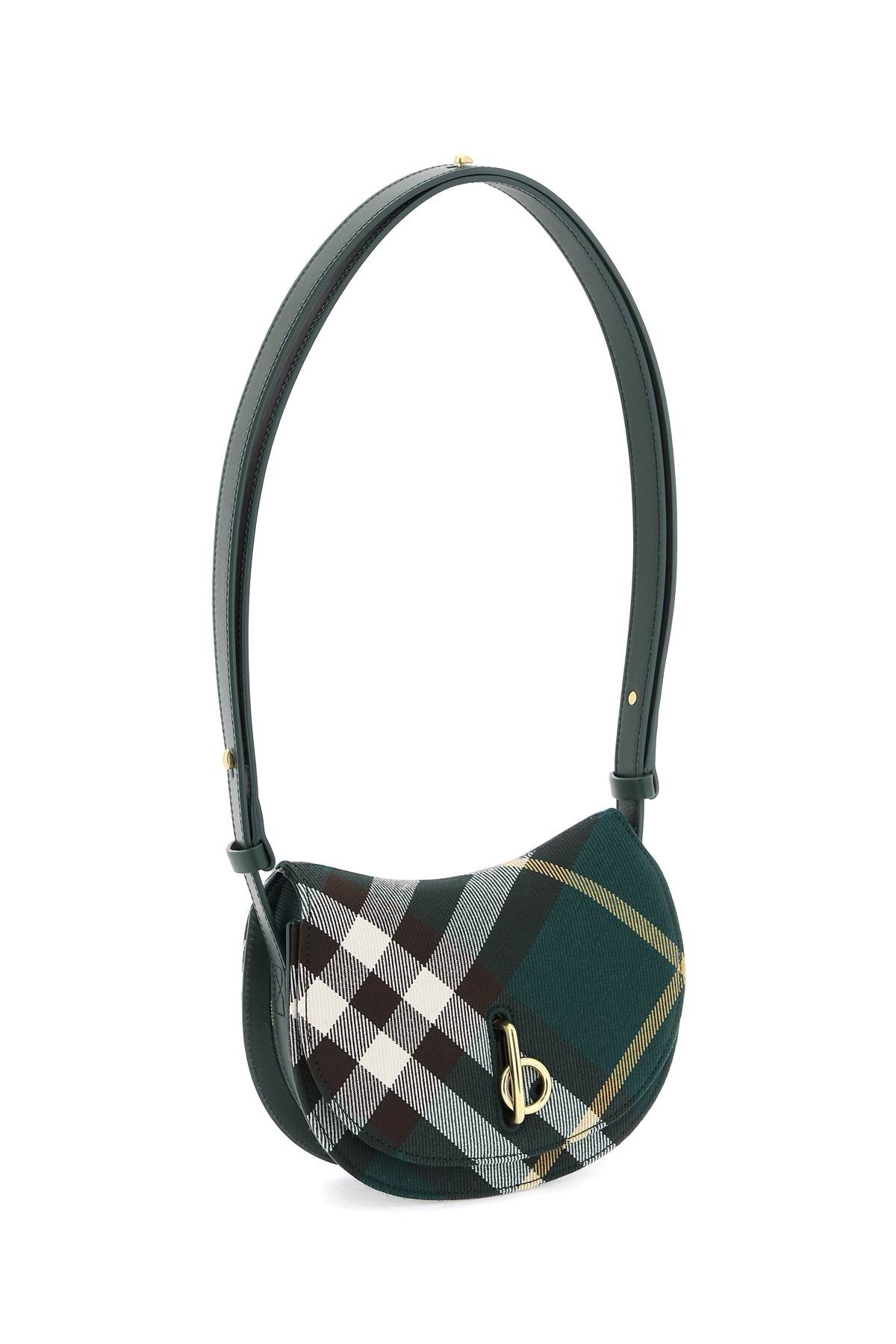 The Burberry Rocking Horse shoulder bag is made of a wool blend with the iconic Burberry Check pattern and features a structured shape reminiscent of children's rocking horses. It has a gold metal "b" closure, leather interior, and an adjustable handle.