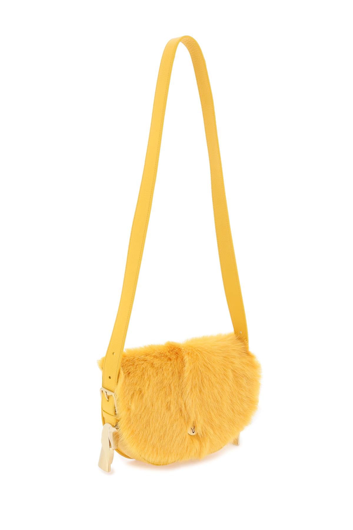 Chess crossbody bag by Burberry made of grained leather and characterized by Knight and Tower side charms. Fur flap, interlocking magnetic closure, leather interior with one open pocket, additional back flat pocket finished with embossed Equestrian Knight Design. Adjustable shoulder strap, gold-tone brushed metalware.