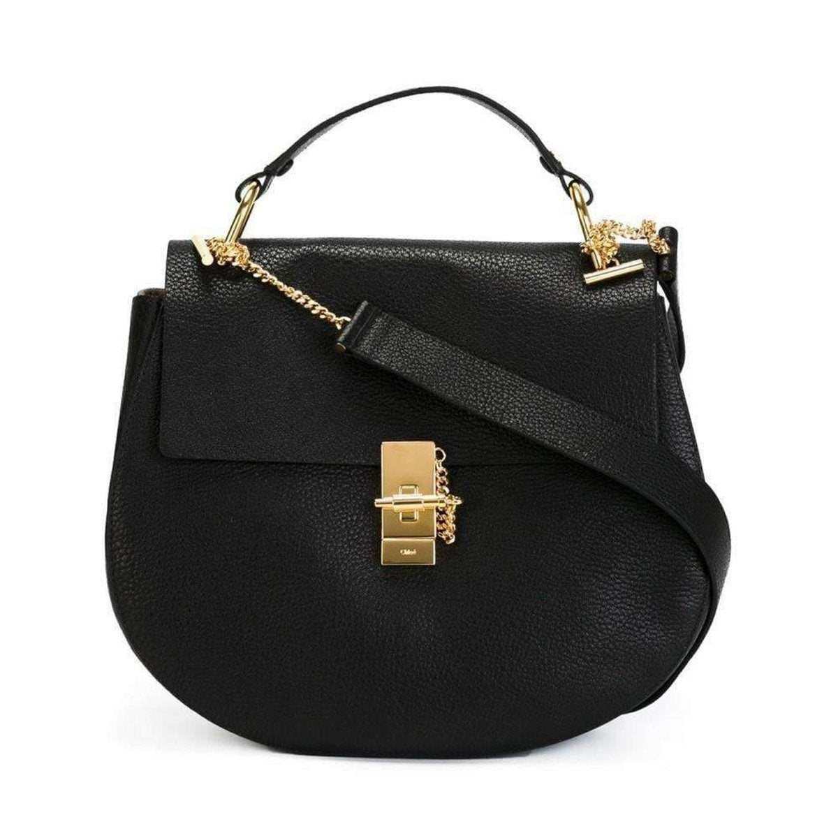 Black lamb skin large 'Drew' satchel from Chloé featuring a foldover top with push-lock closure, gold-tone hardware, a top handle, an adjustable shoulder strap, an internal zipped pocket, an internal logo stamp, a pebbled leather texture and a suede lining.