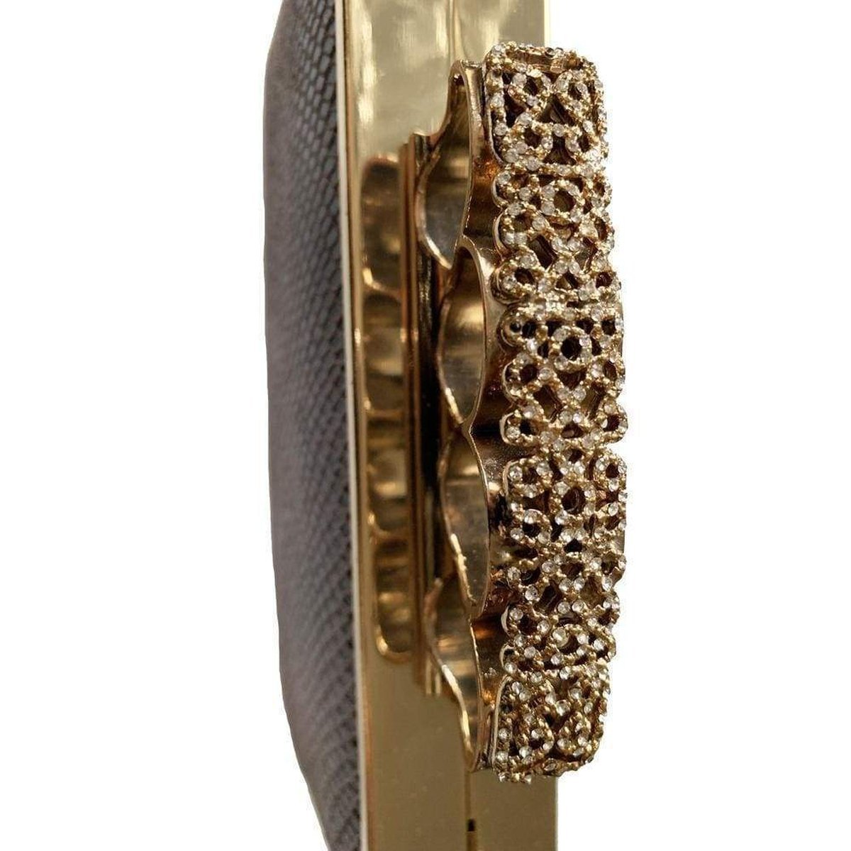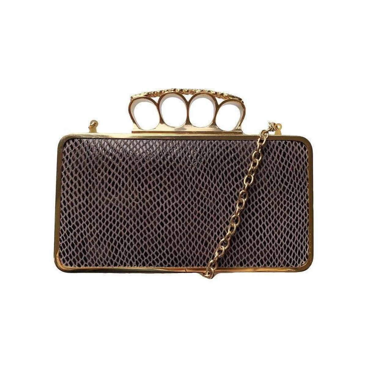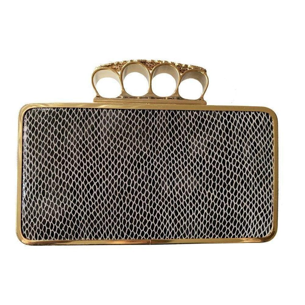 BCBGMaxazaria hard clutch with yellow gold and jewel embellished brass knuckle handle.