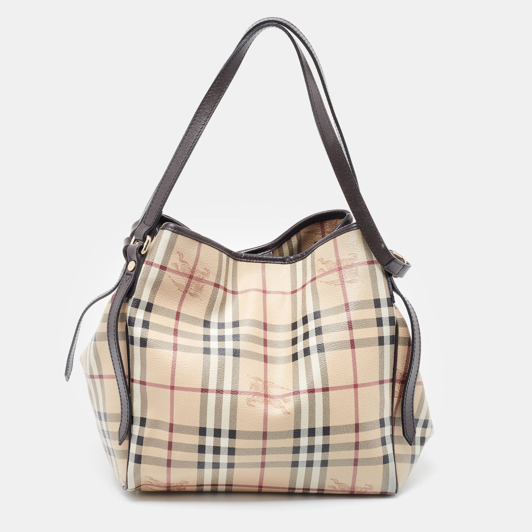 The Canterbury tote from Burberry will suffice your handbag needs with complete elegance. This tote is designed using beige brown Haymarket Check coated canvas, leather, and gold tone hardware. It is supported by dual handles and comes with a canvas lined interior.