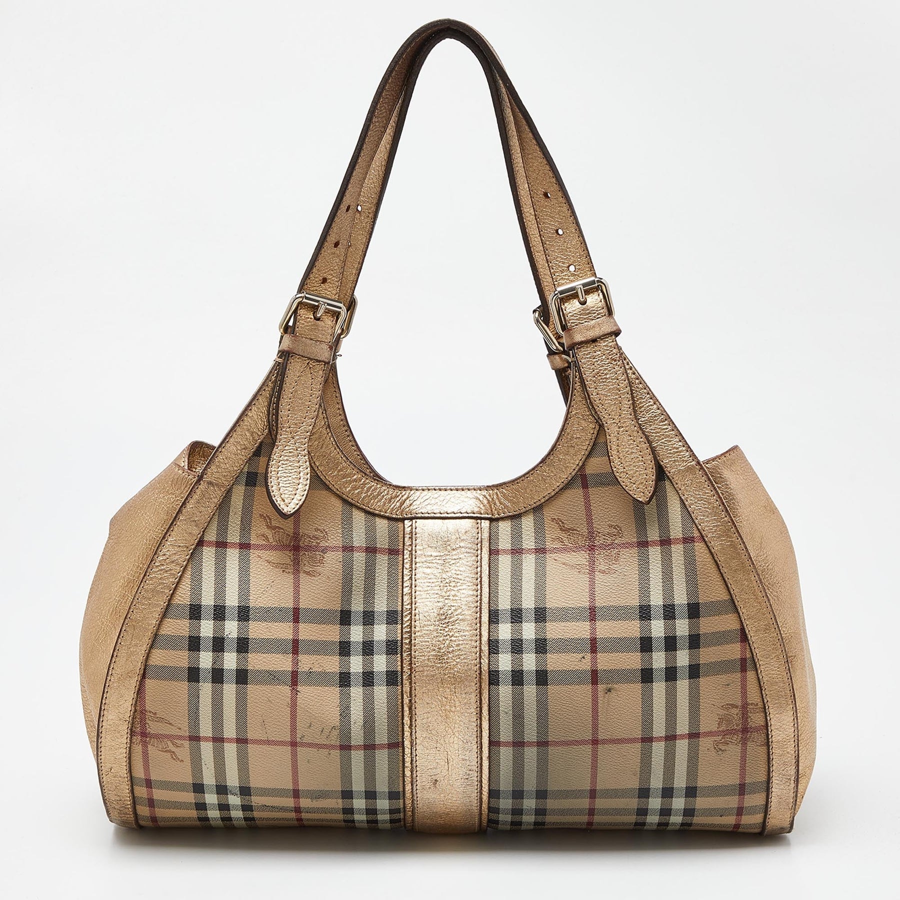 This hobo from Burberry is crafted from PVC in classic Haymarket check and completed with leather trims. The fabric lined interior will hold your daily essentials and the hobo is complete with a single handle. Simple in design, it is perfect for everyday use.