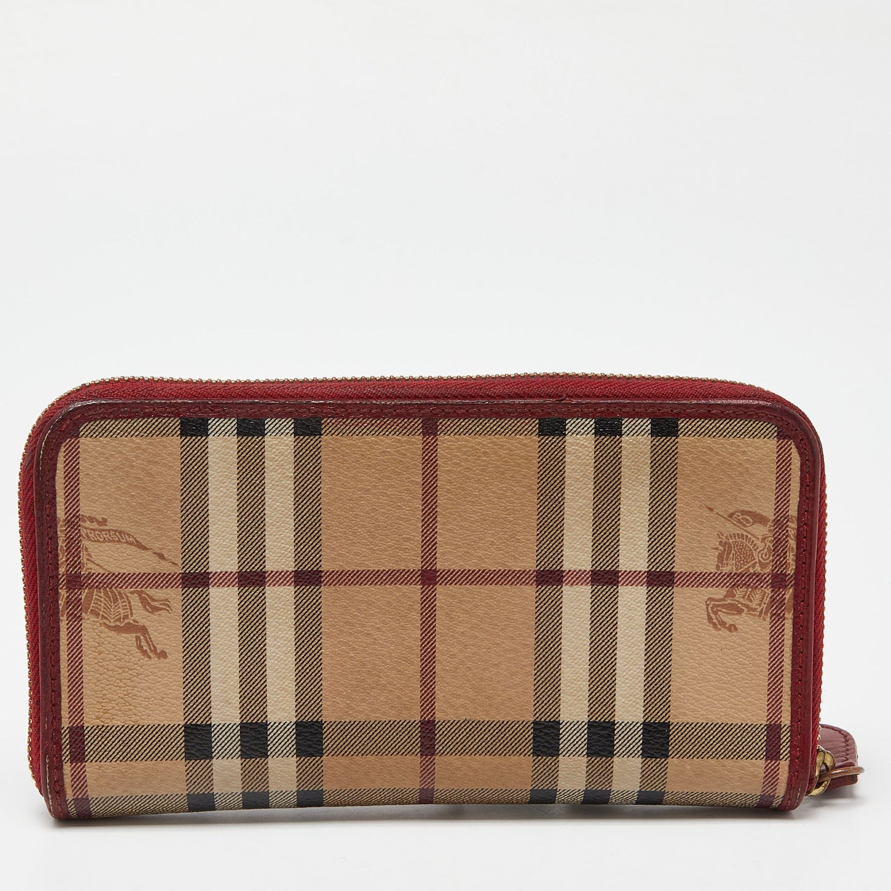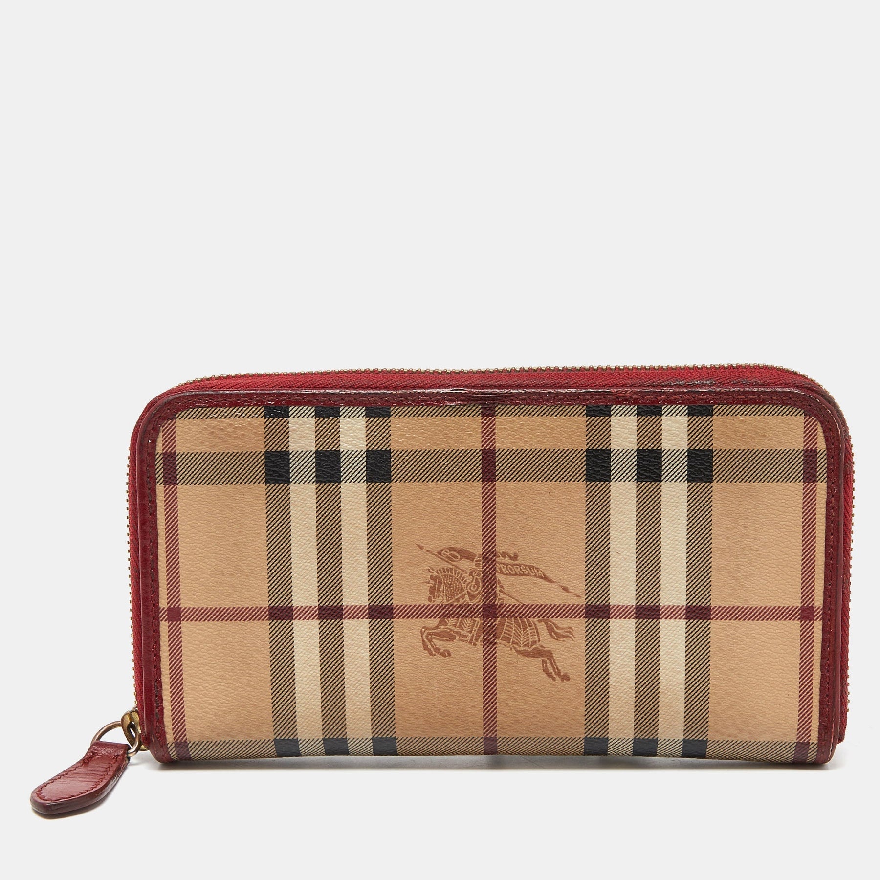 BURBERRY Beige/Red Haymarket Check Coated Canvas Zip Around Wallet