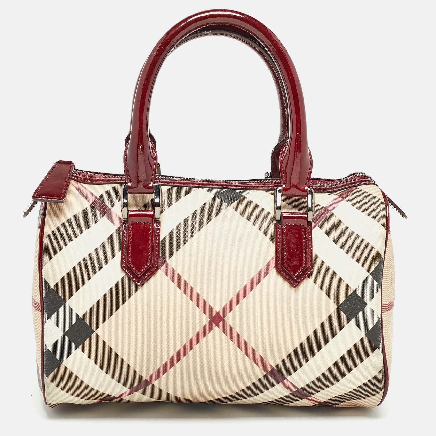 BURBERRY Beige/Red Nova Check PVC and Patent Leather Chester Boston Bag