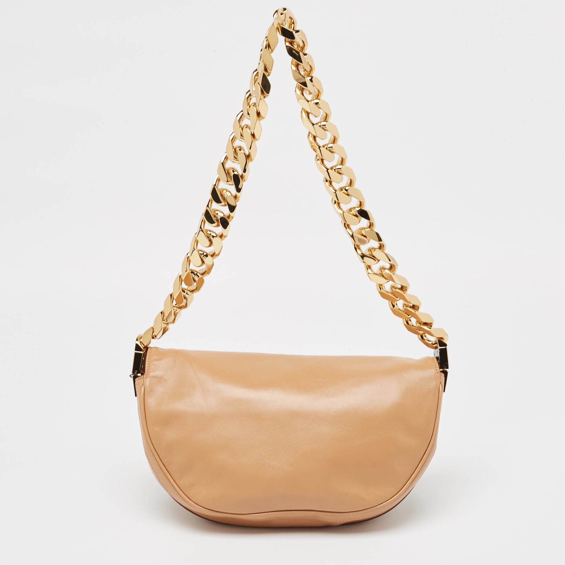 With an architectural shape, this Burberry Olympia bag resembles the crescent moon. The brand signature on the front lends to its instant identification, and it can be carried conveniently with a chain shoulder strap. Capturing the essence of feminity, it celebrates beauty through its creative design.