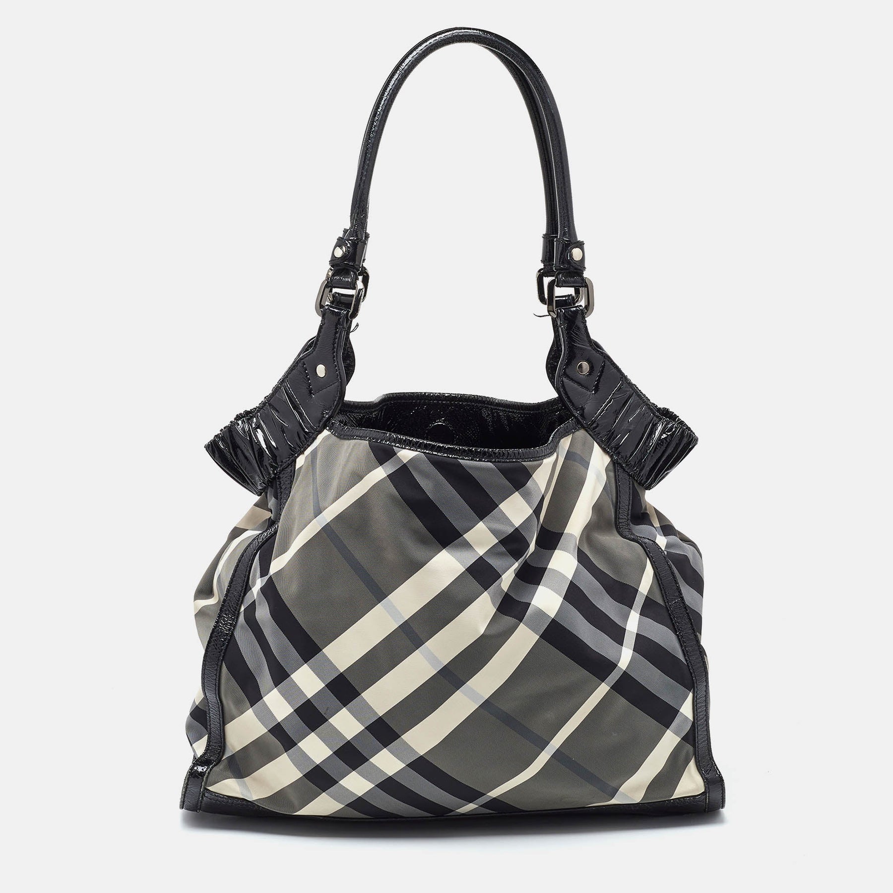BURBERRY Black Beat Check Nylon and Patent Leather Tote