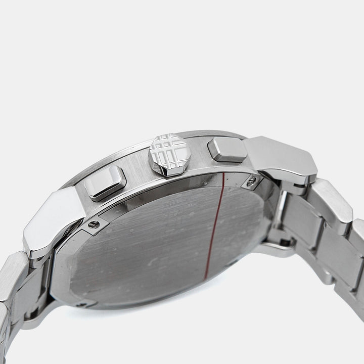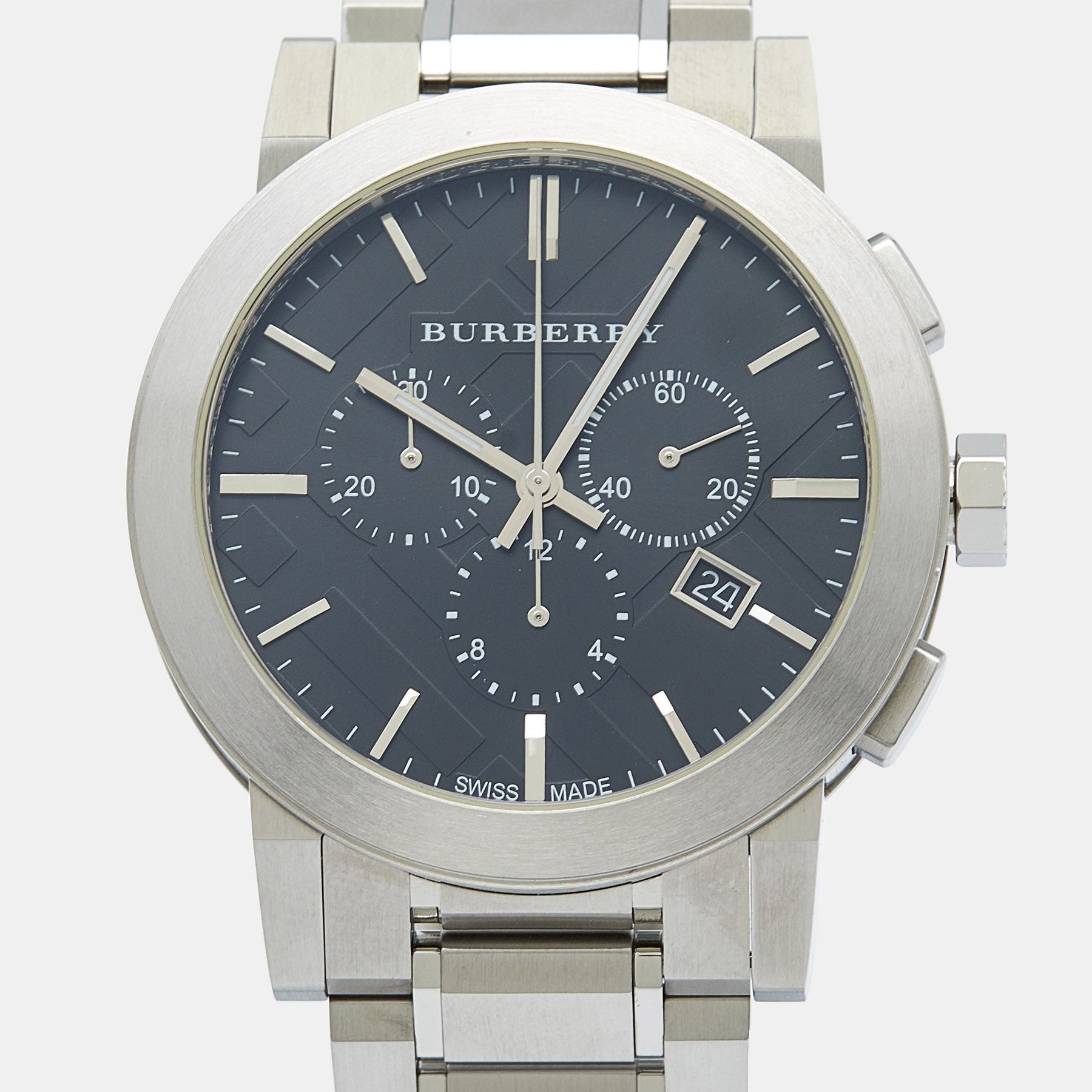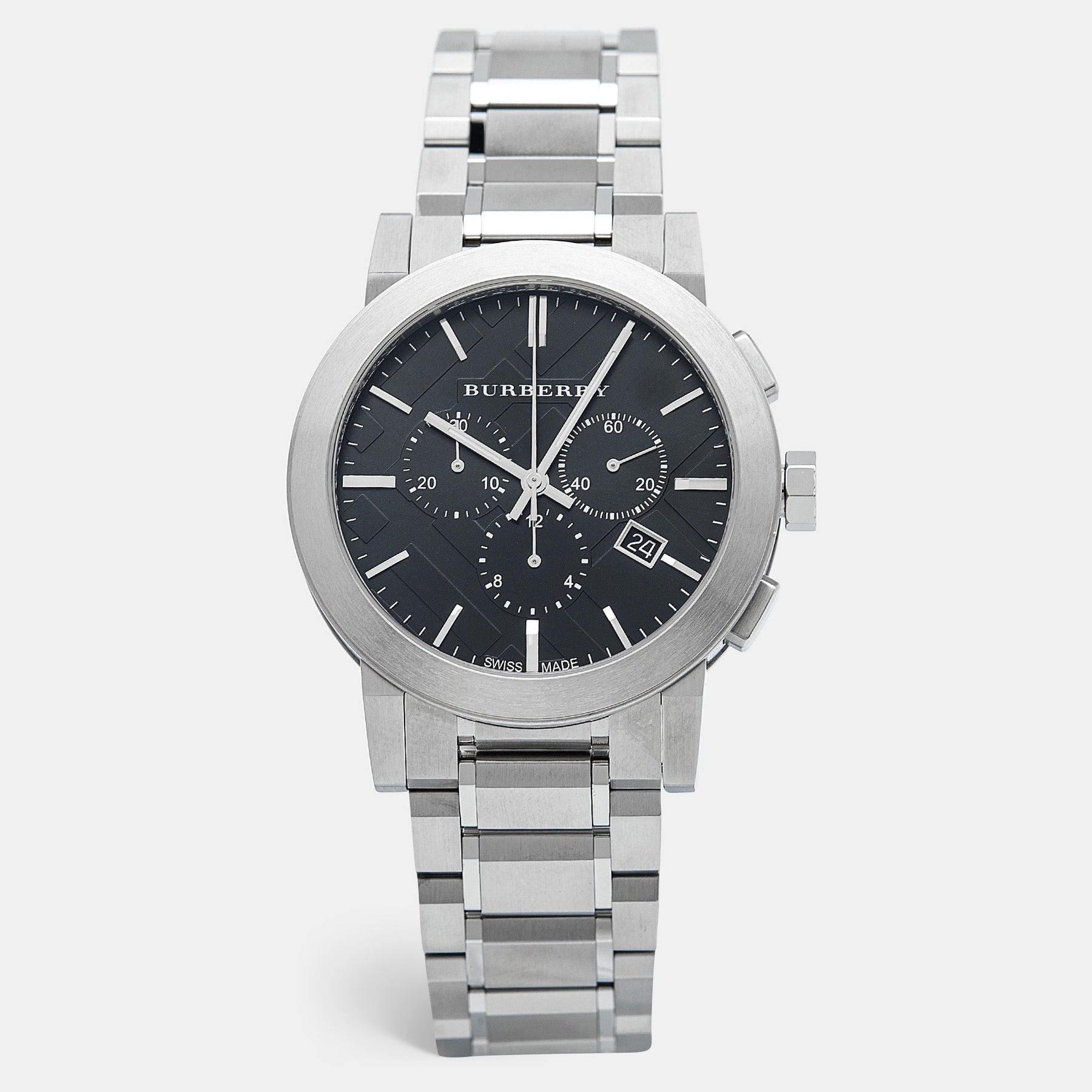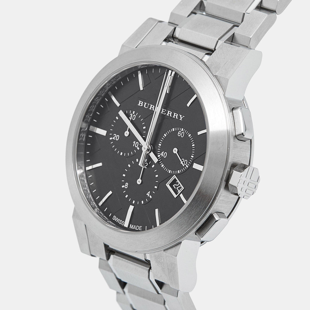 Your everyday style deserves a luxury touch like this wristwatch from Burberry. It is made from stainless steel and has a black dial with index hours markers, minute markers around the outer rim, a date window at the 4 oclock position, and three subdials for the chronograph. The watch is topped with a water resistance of 50 meters.