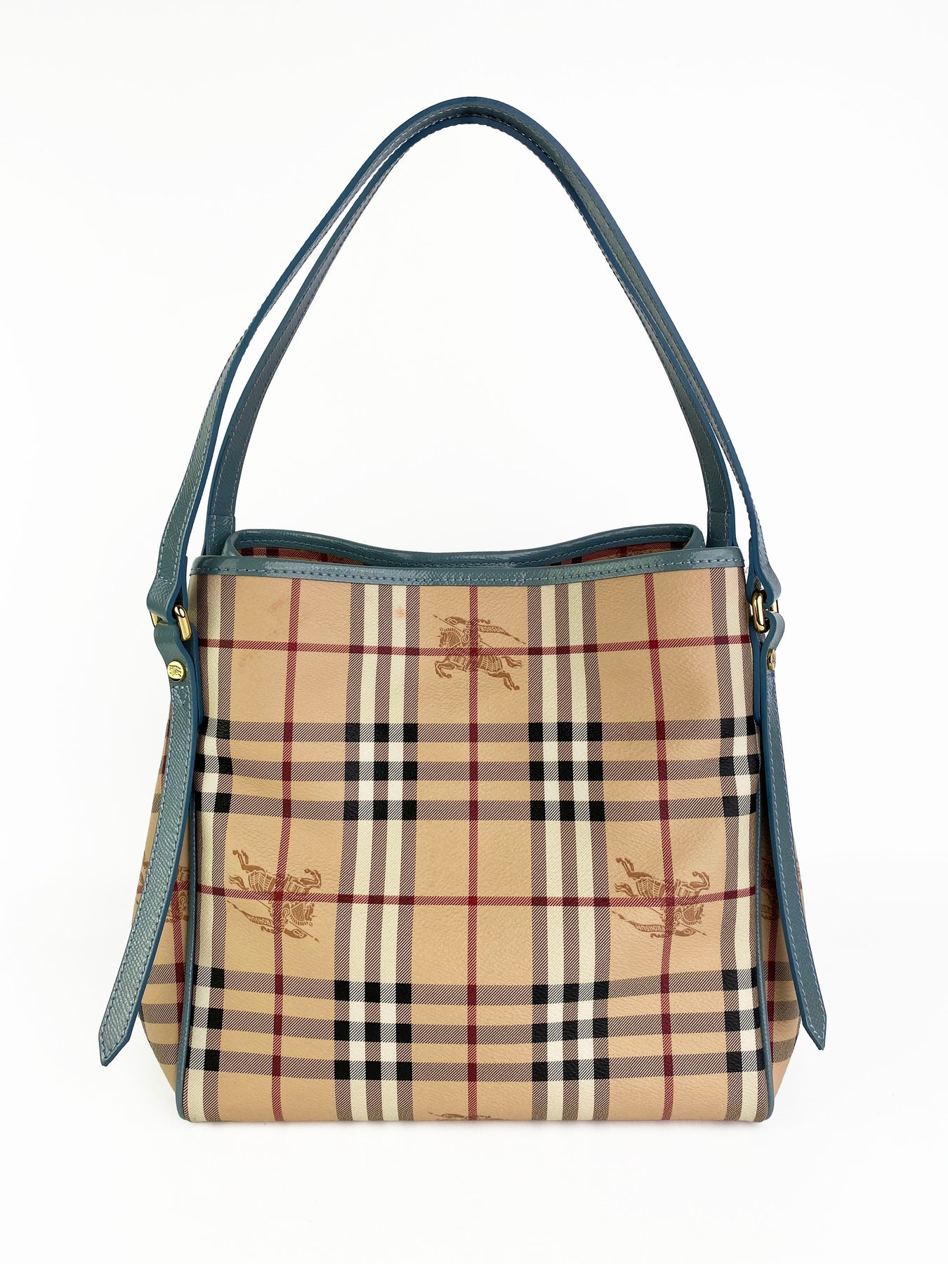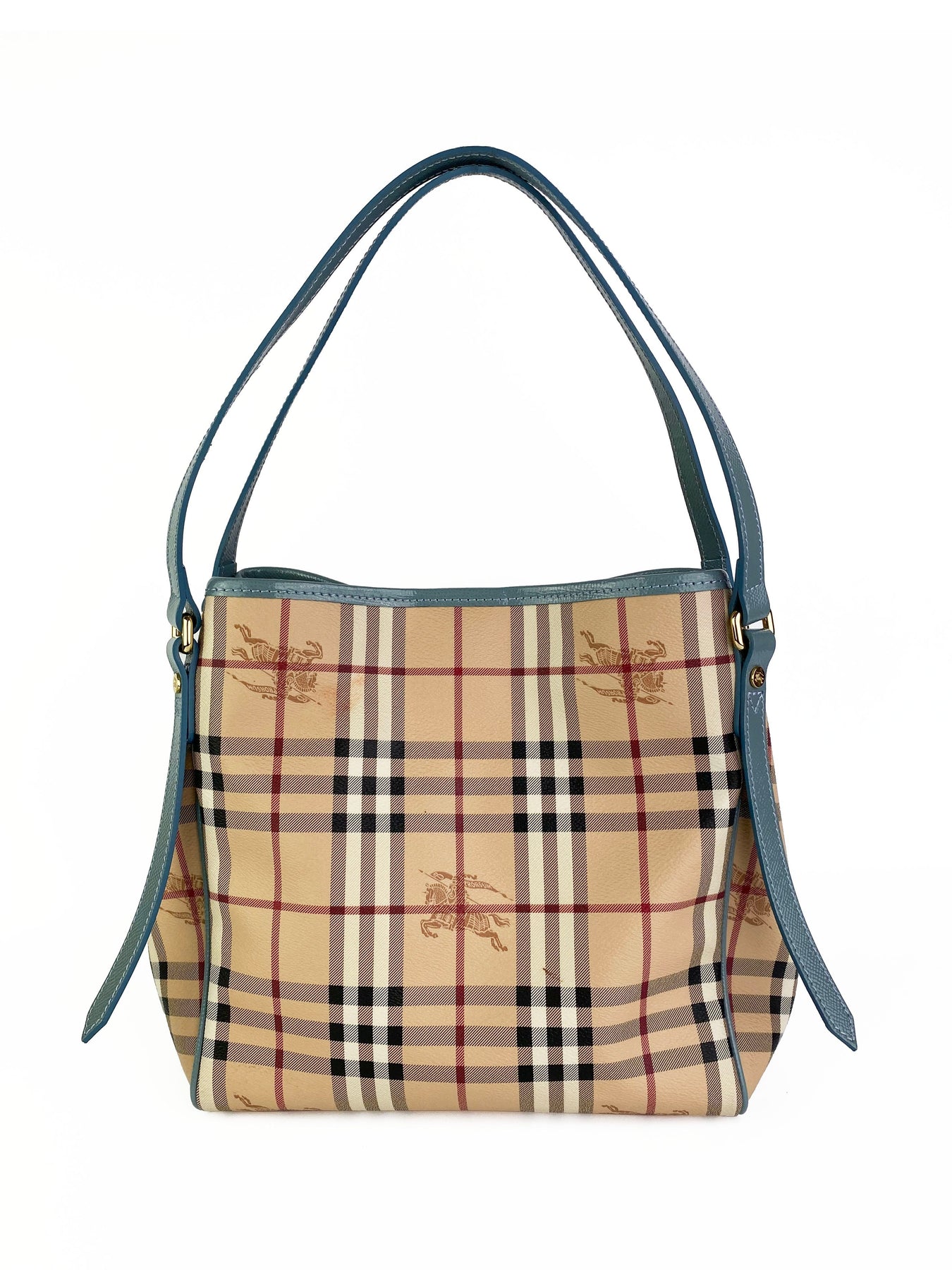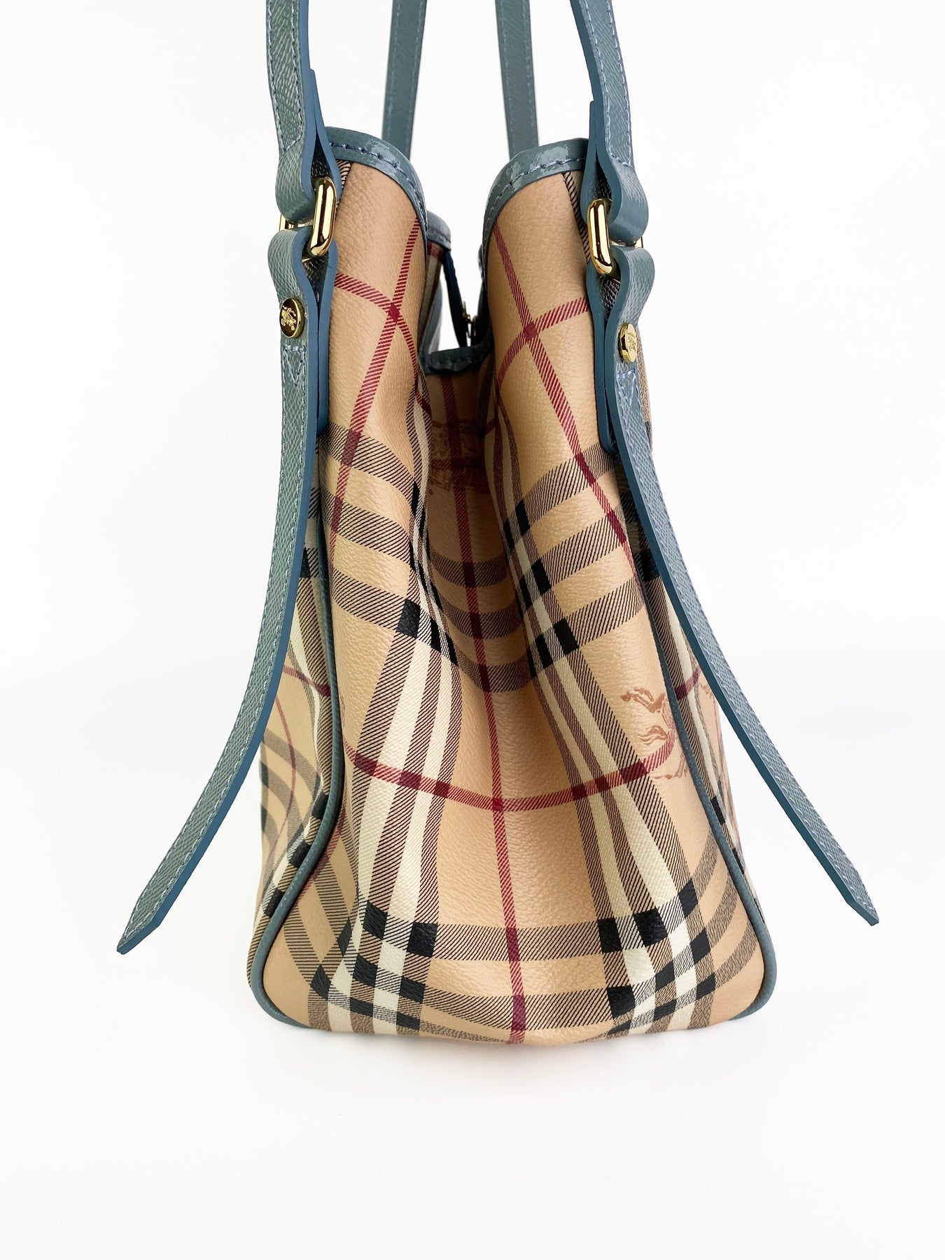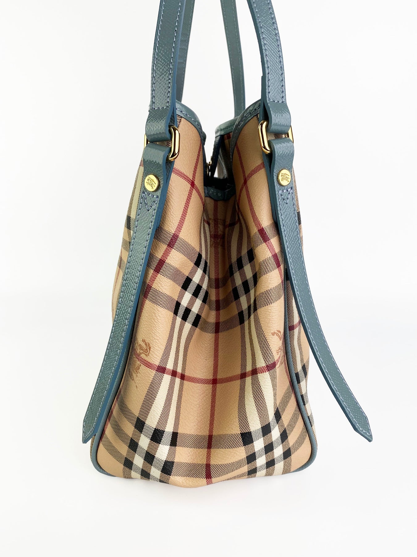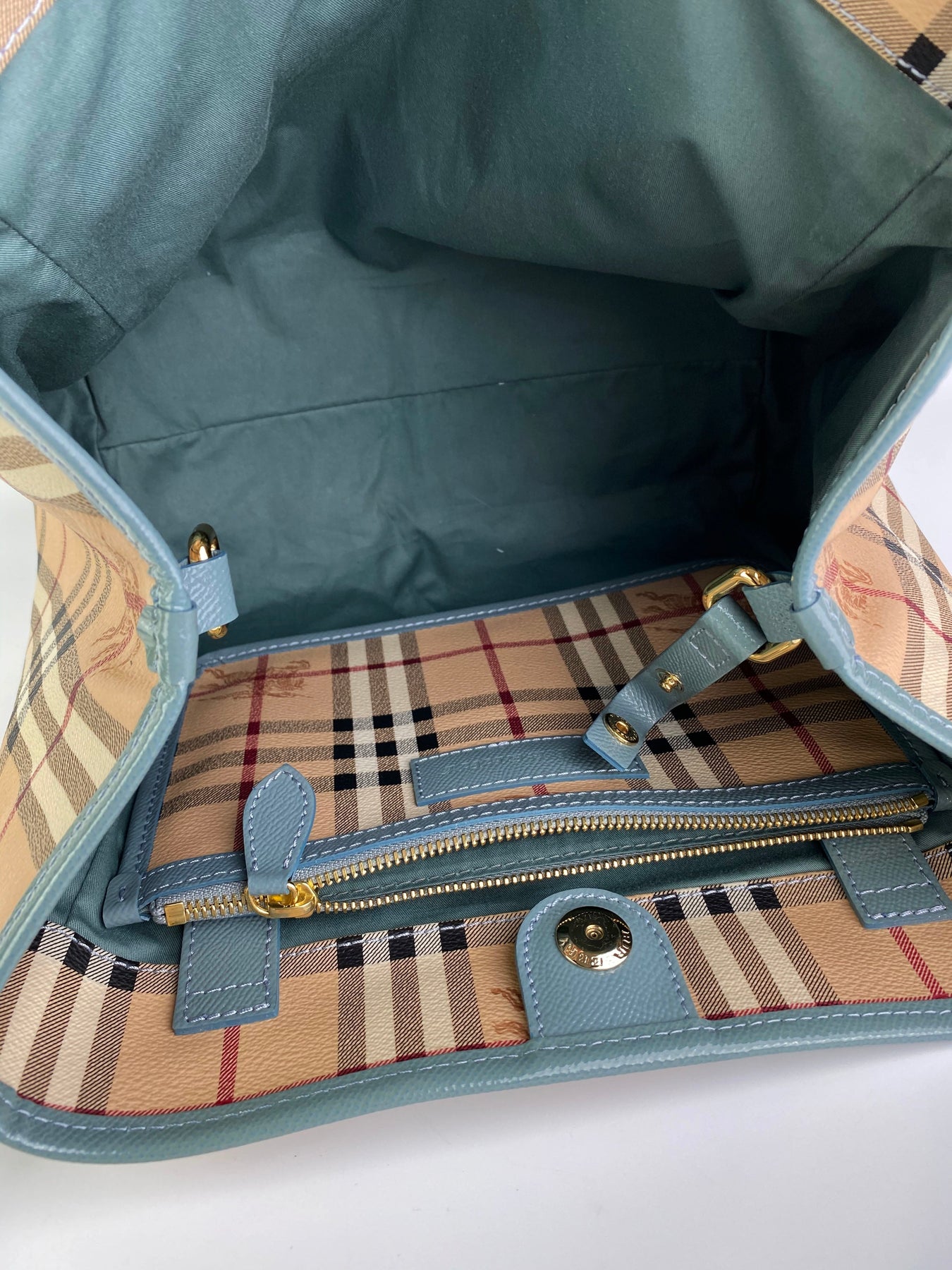 Description : Effortlessly stylish tote bag with light blue trim in good condition; lipstick marks on outer, some marks inner.