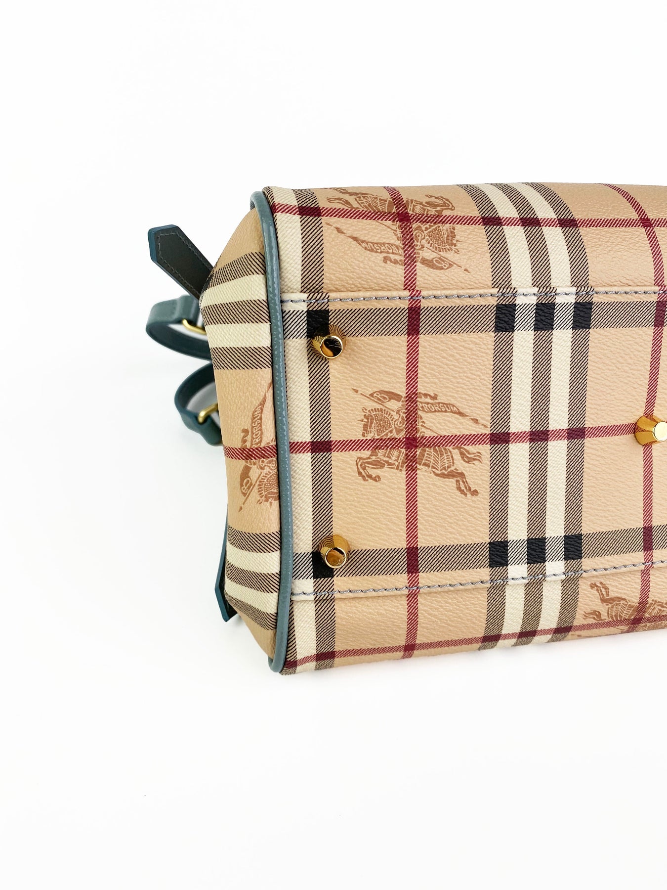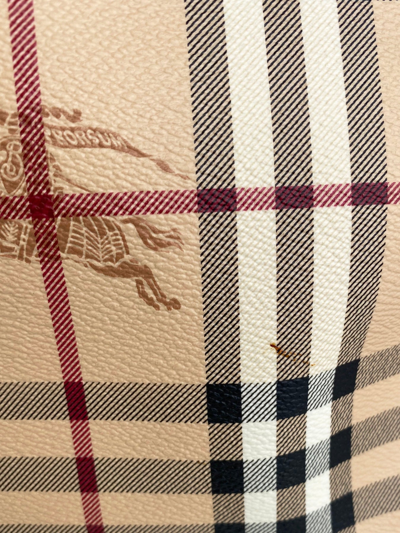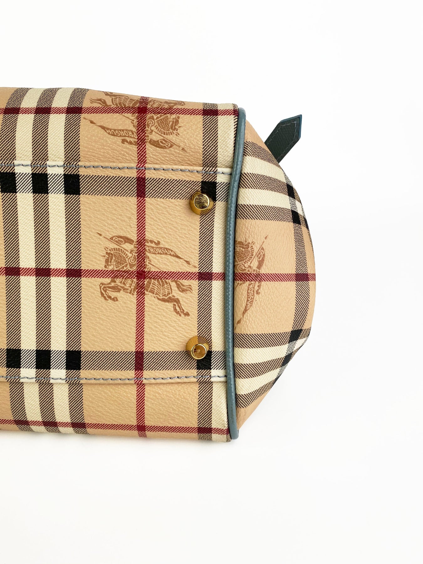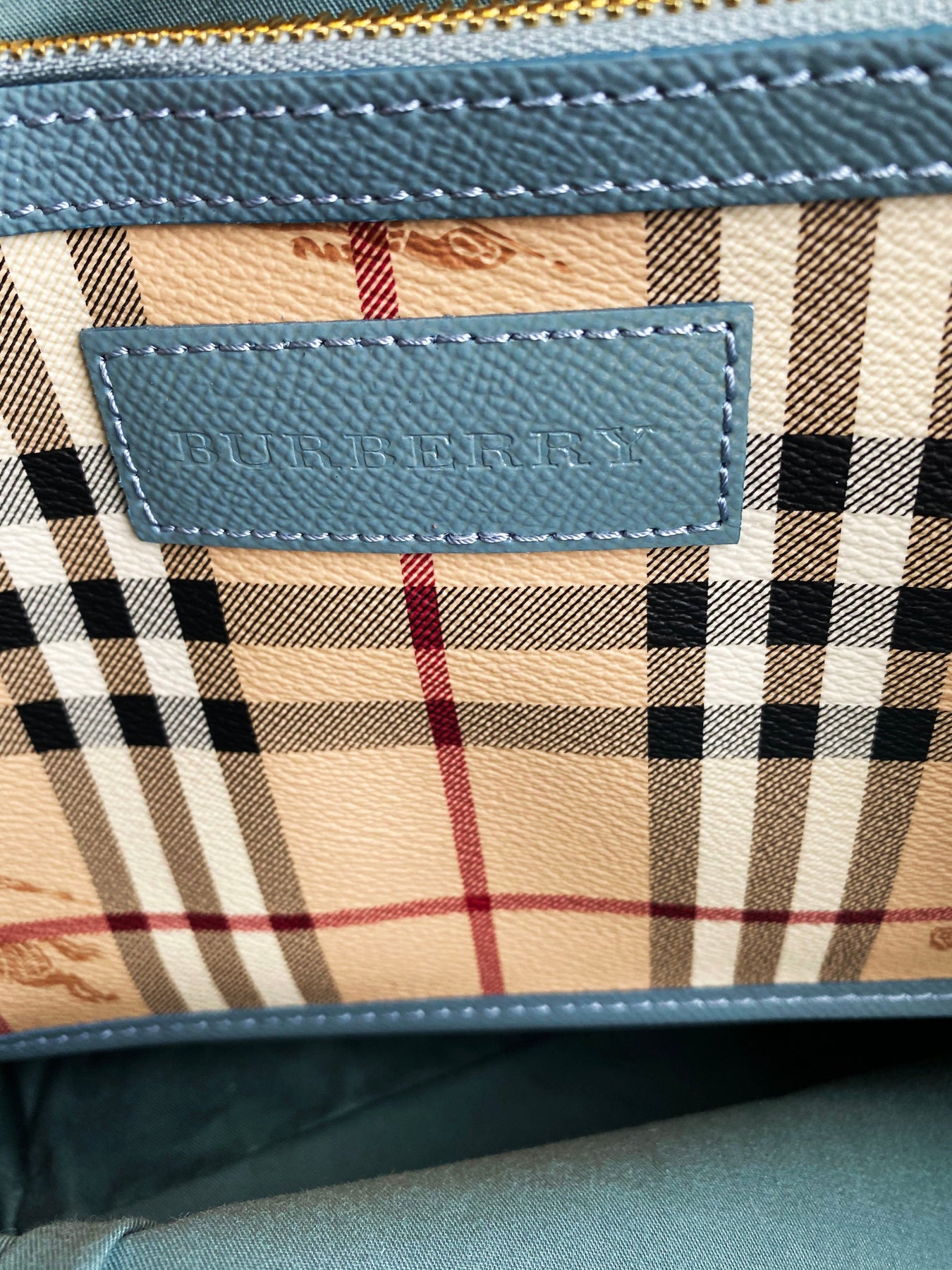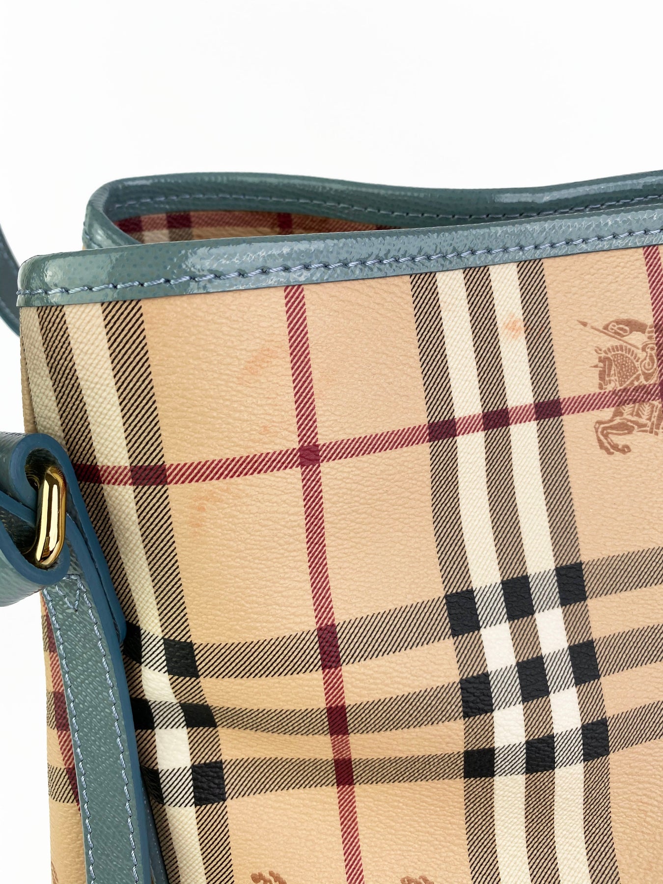 Description : Effortlessly stylish tote bag with light blue trim in good condition; lipstick marks on outer, some marks inner.