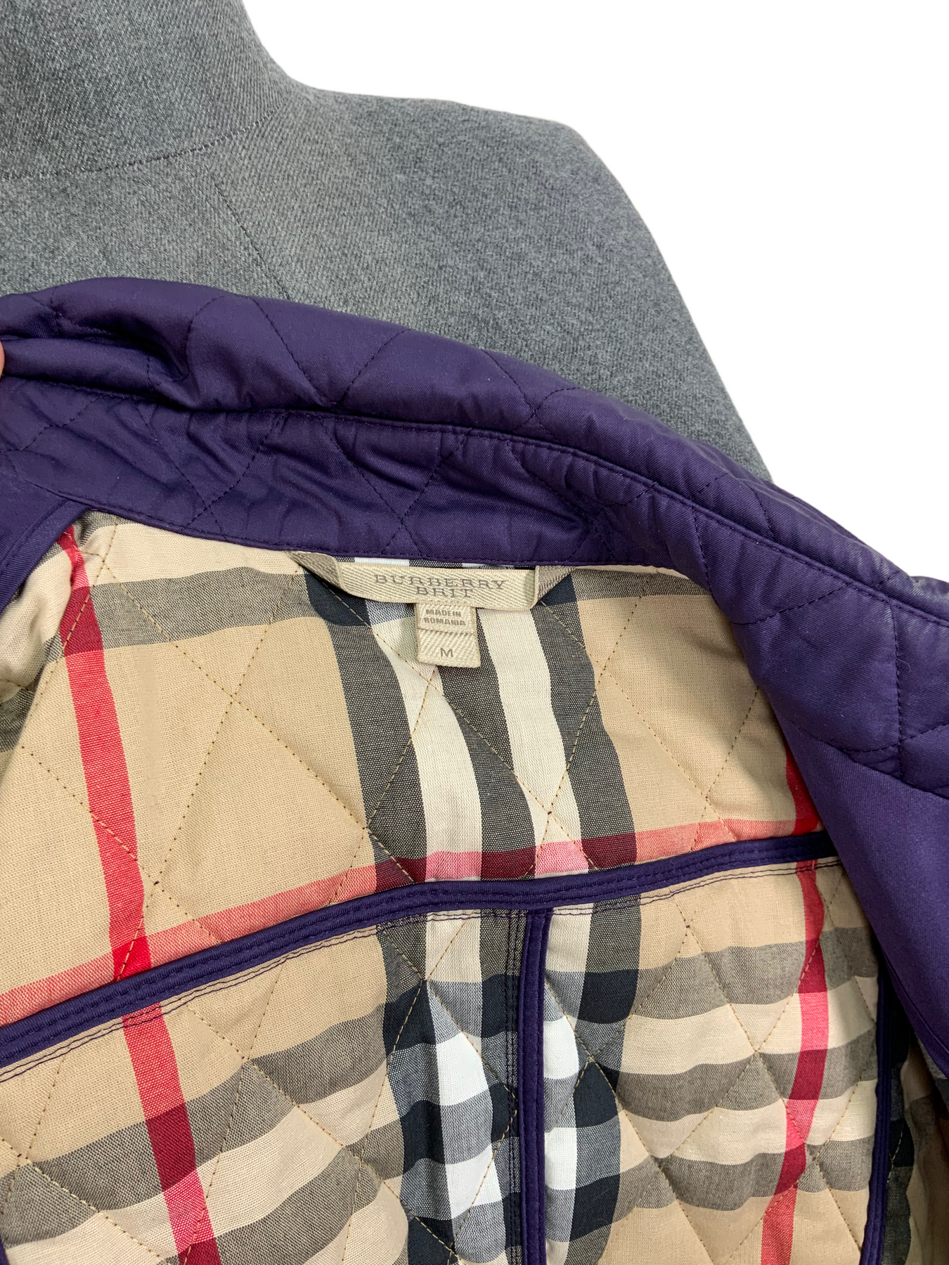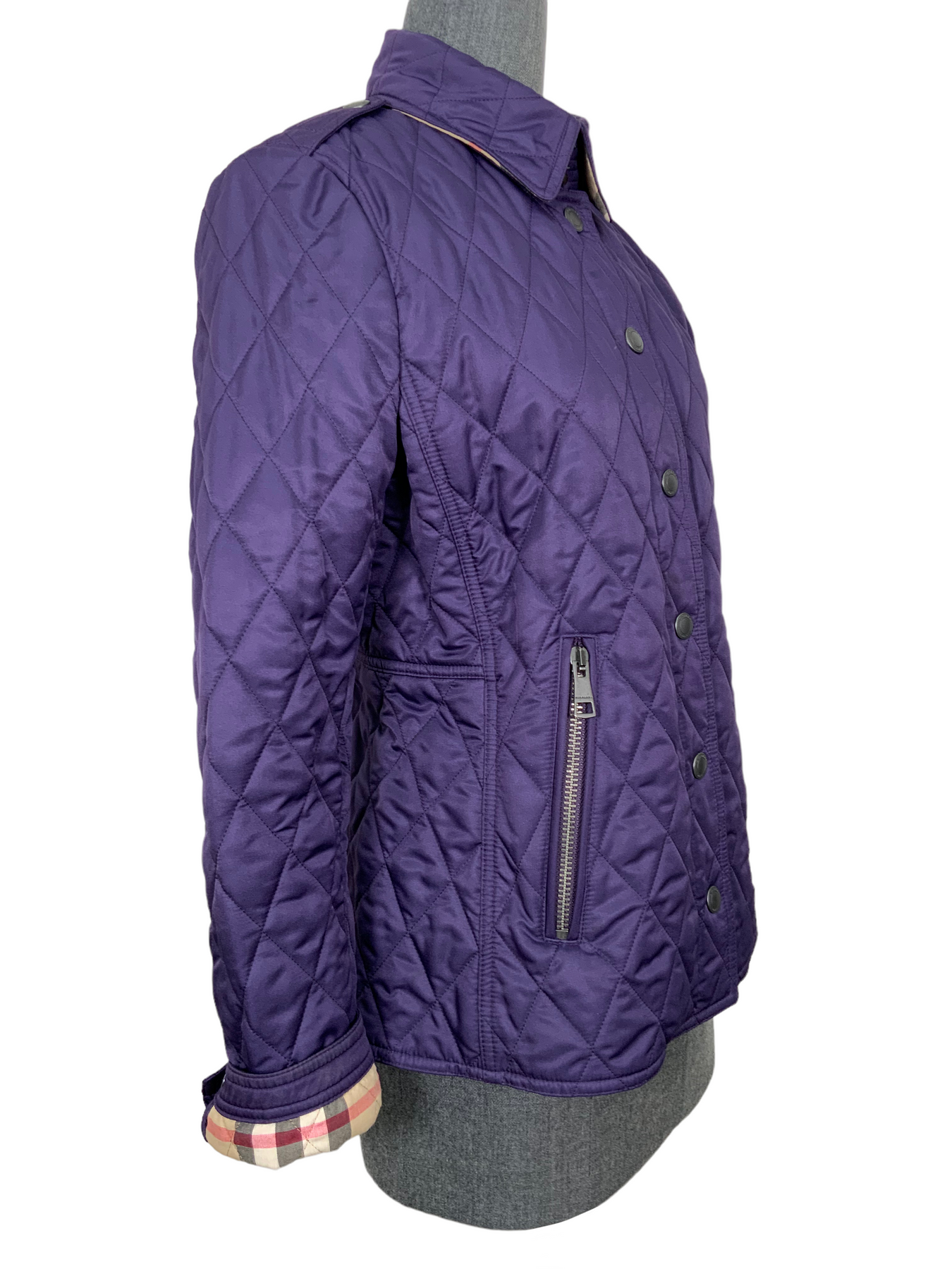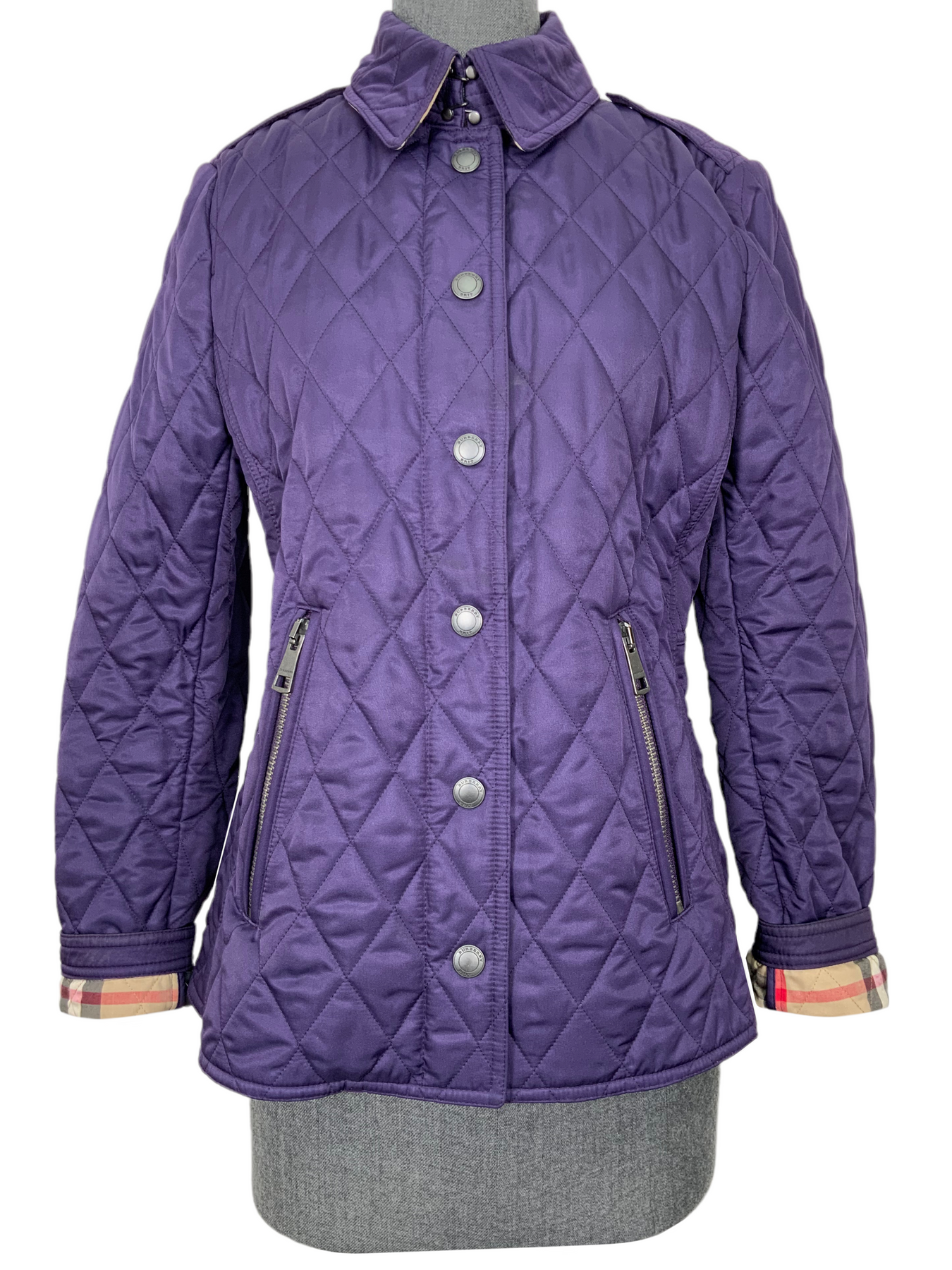 We the ity of this Burberry Brit Diamond Quilted Jacket Size M in purple featuring a trim fit with long sleeves, dual zip pockets, front logo-engraved snap closures and classic checkered lining.