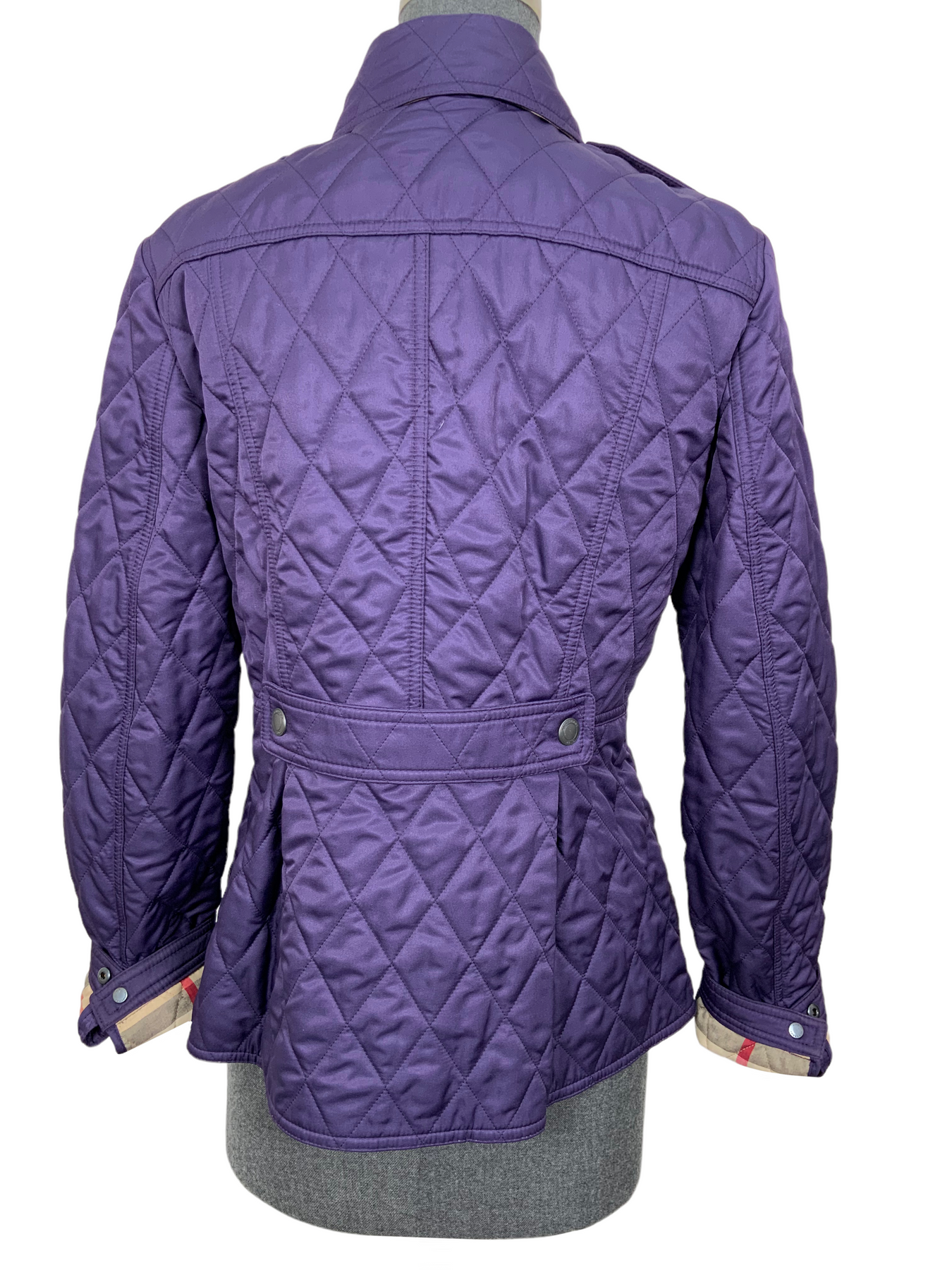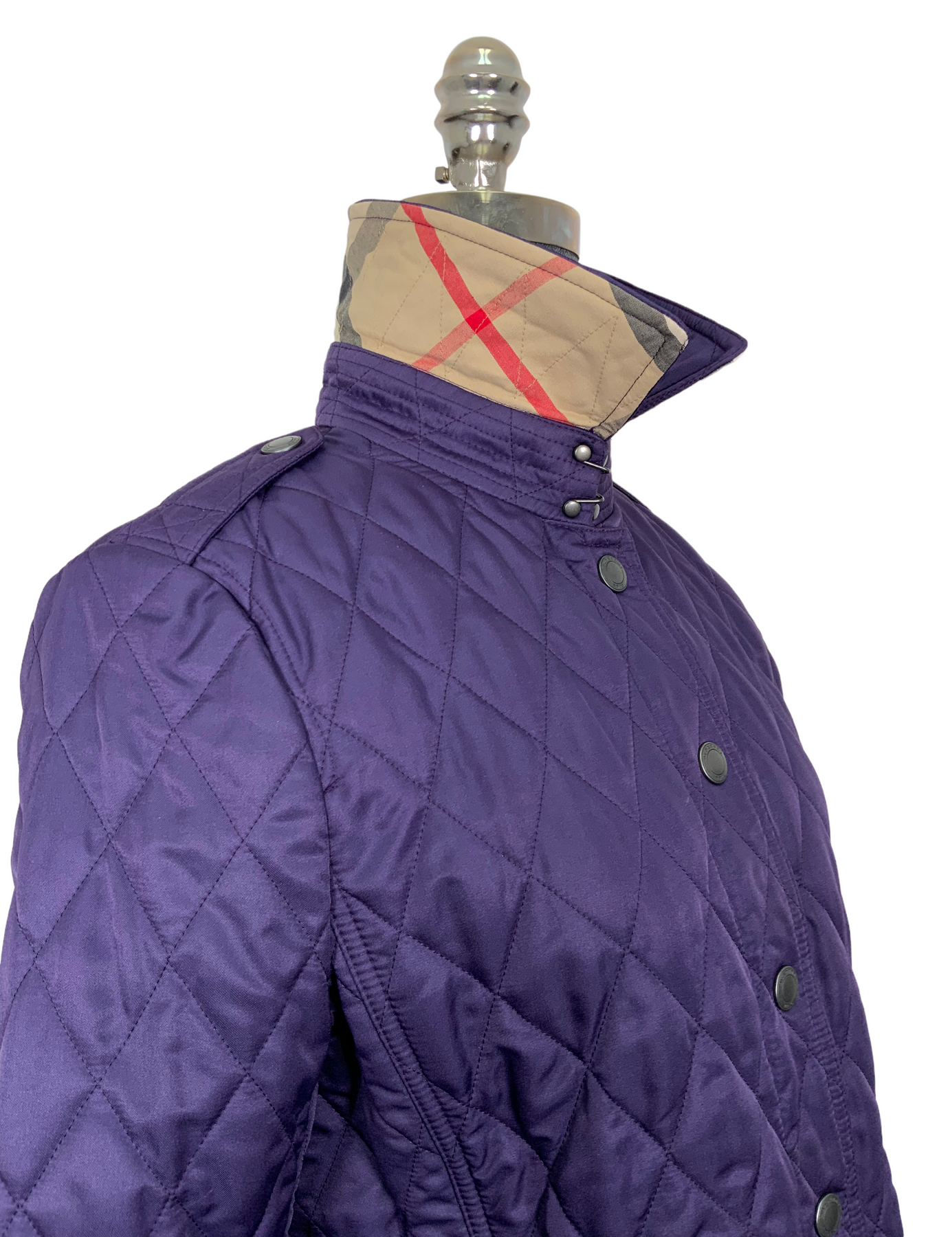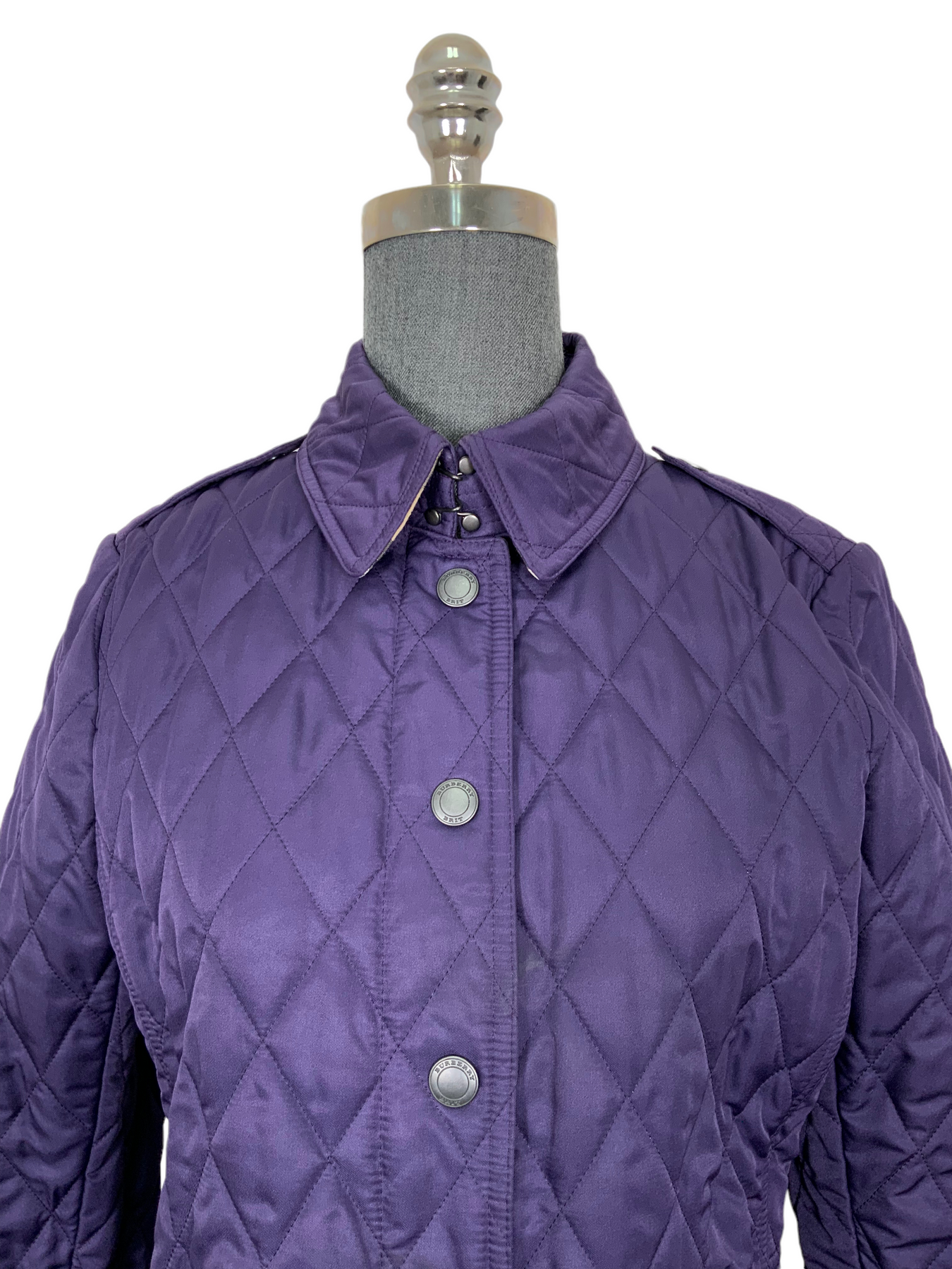 We the ity of this Burberry Brit Diamond Quilted Jacket Size M in purple featuring a trim fit with long sleeves, dual zip pockets, front logo-engraved snap closures and classic checkered lining.