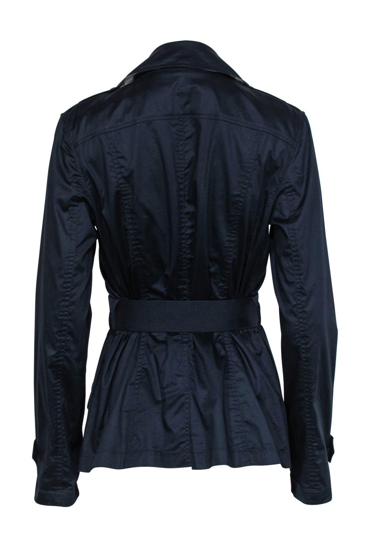 Go for a stroll in the park wearing this timeless and classic navy jacket by Burberry! This button down piece features a double breasted silhouette and belted cuffs, which adds a sophisticated and refined edge to your wardrobe. This must-have jacket pairs well with anything from jeans to heels, but we love this styled down with booties!