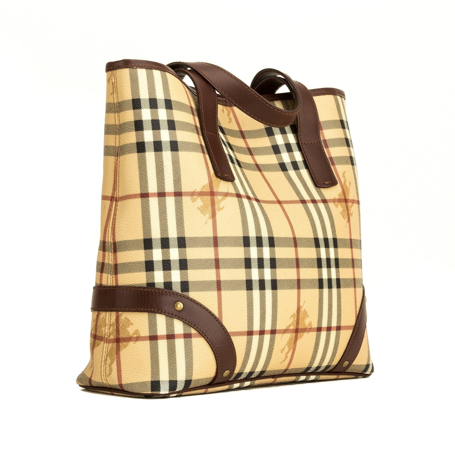 This is an Brand Inspired, BURBERRY Brown Leather Check Maymarket Tote. This is a chic and classic Burberry tote. It features the house check canvas with brown leather trims, flap top handles, magnetic snap closure, and polished gold metal pieces. The interior has a black textile lining, a zip pocket, and two open pockets. It's classy and great for every day!