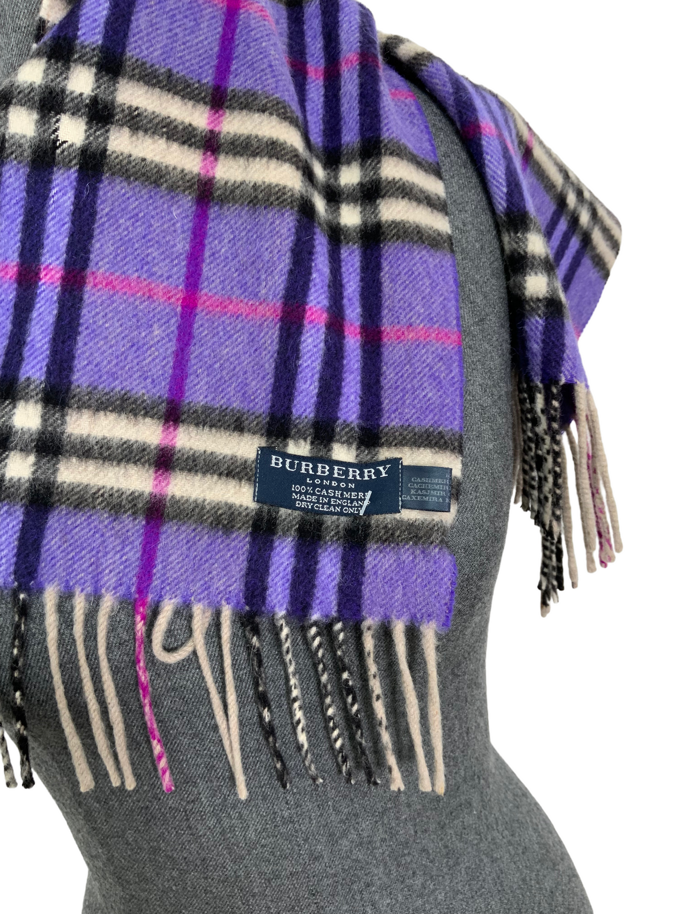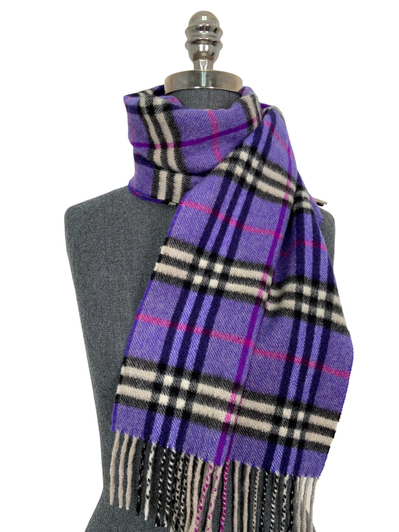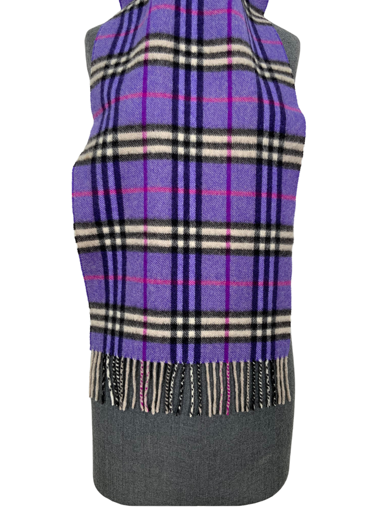 We the ity of this brand new Burberry Checkered Plaid Cashmere Scarf with Fringe featuring a light blue, gray and ivory signature graphic print with a fringe trim.