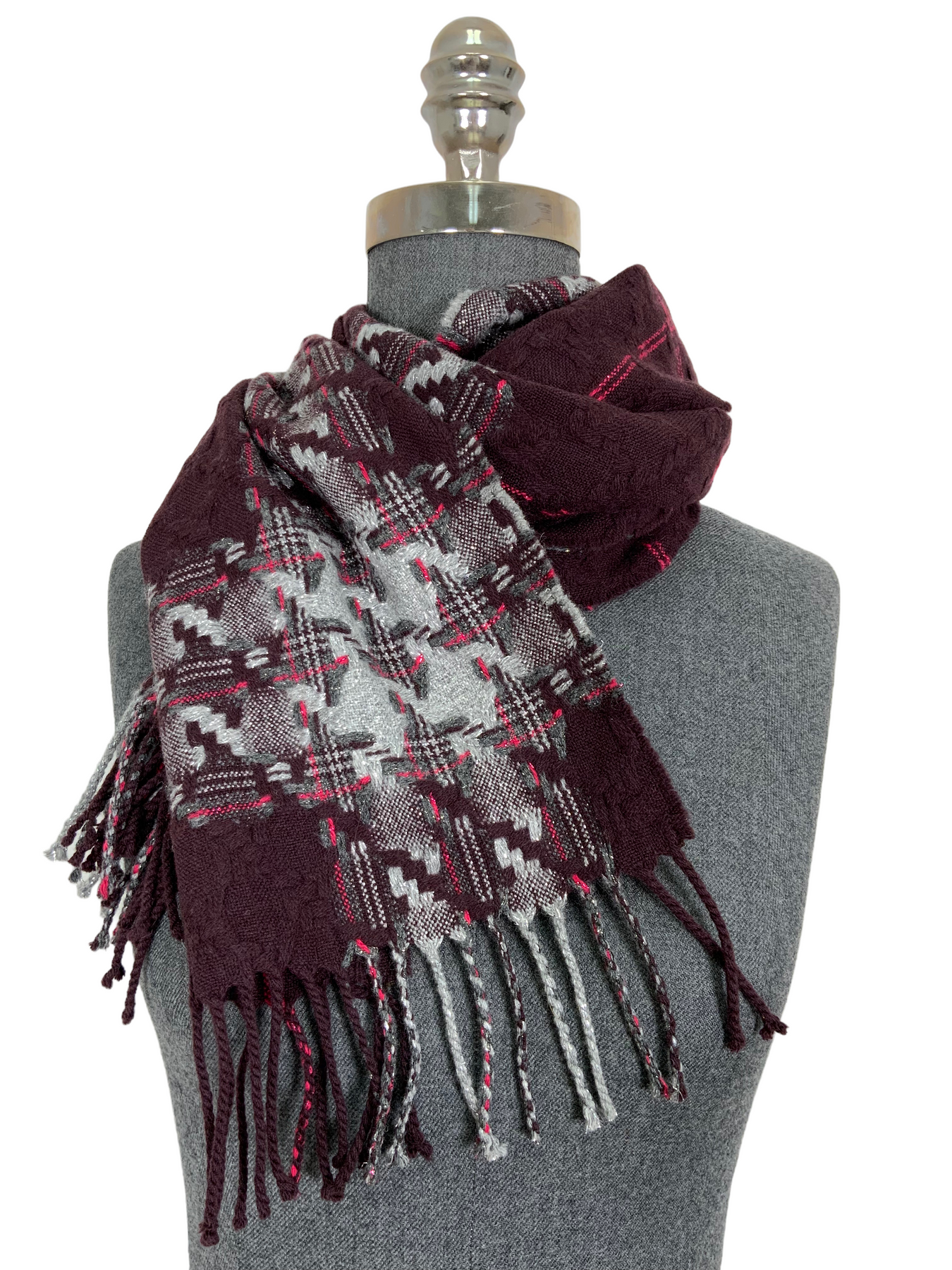 We the ity of this brand new Burberry Checkered Plaid Wool Scarf with Fringe featuring a plum, hot pink and metallic silver plaid graphic print with a fringe trim.