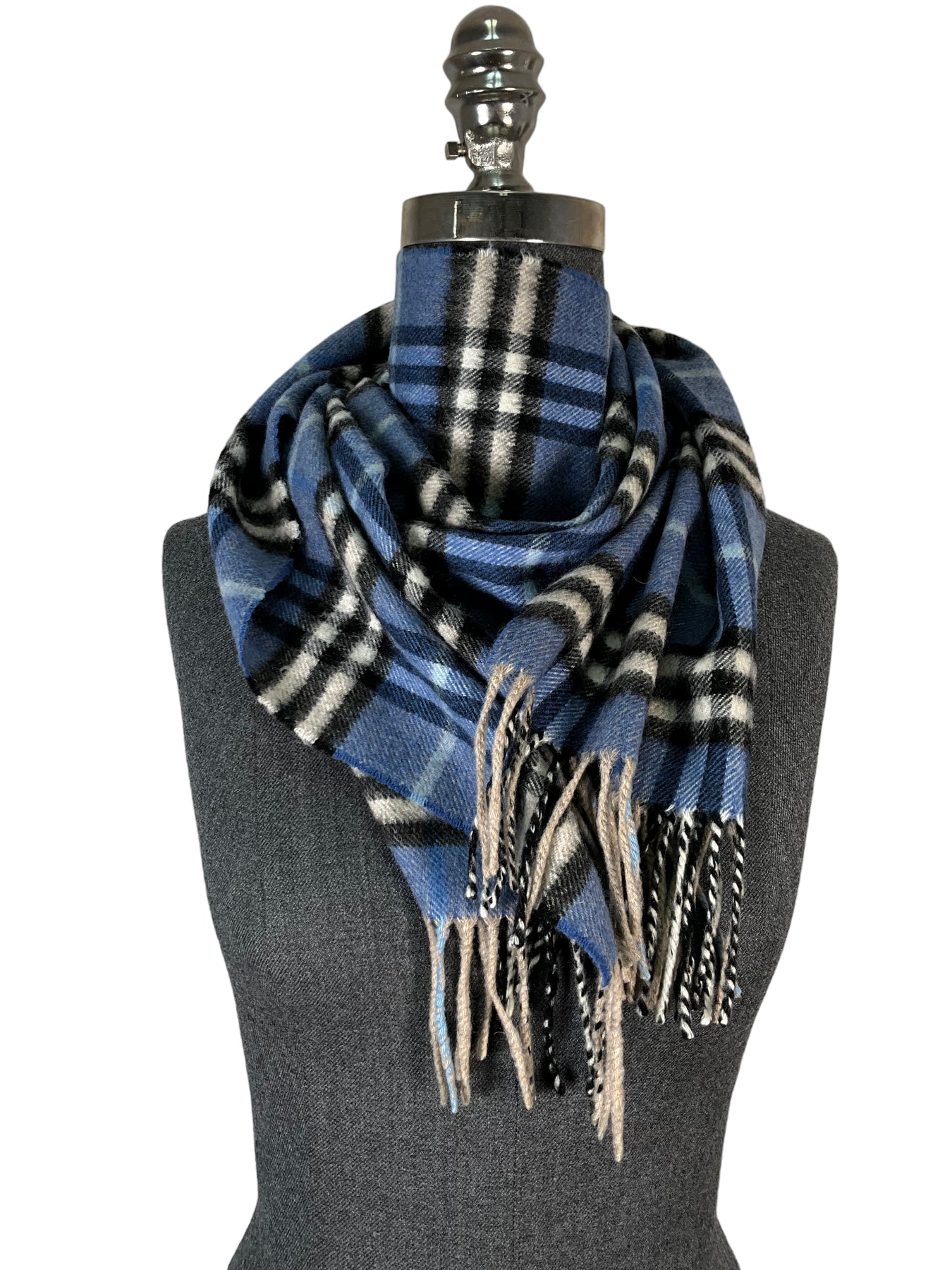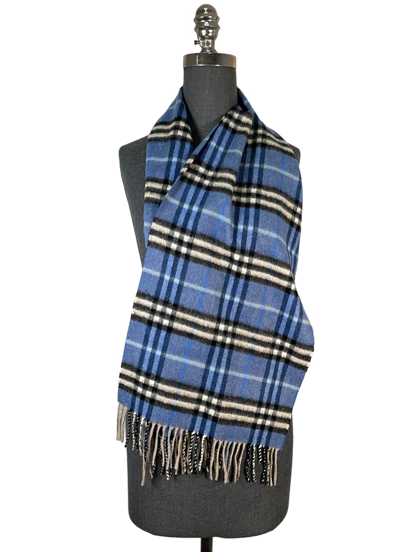 Add this beautiful classic Burberry scarf to your collection. This scarf is crafted from 100% cashmere and features the iconic check in blue, black, and beige.