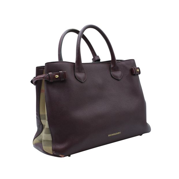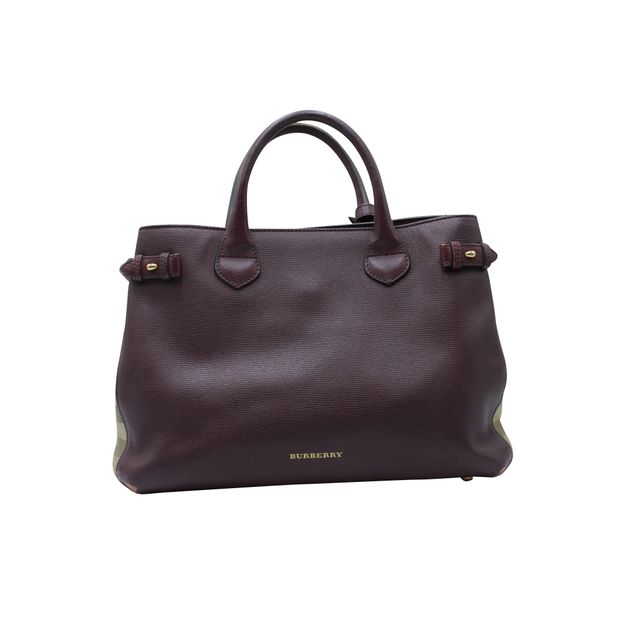 BURBERRY Dark Purple Grained Leather Tote - Checked Pattern On Sides