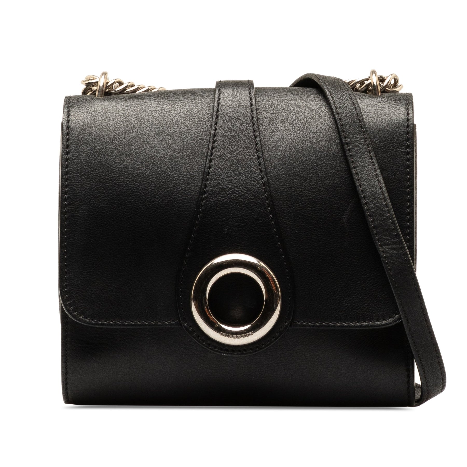 This crossbody bag features a leather body, a curb chain strap, a front flap with silver-tone grommet hardware, and an interior slip pocket.