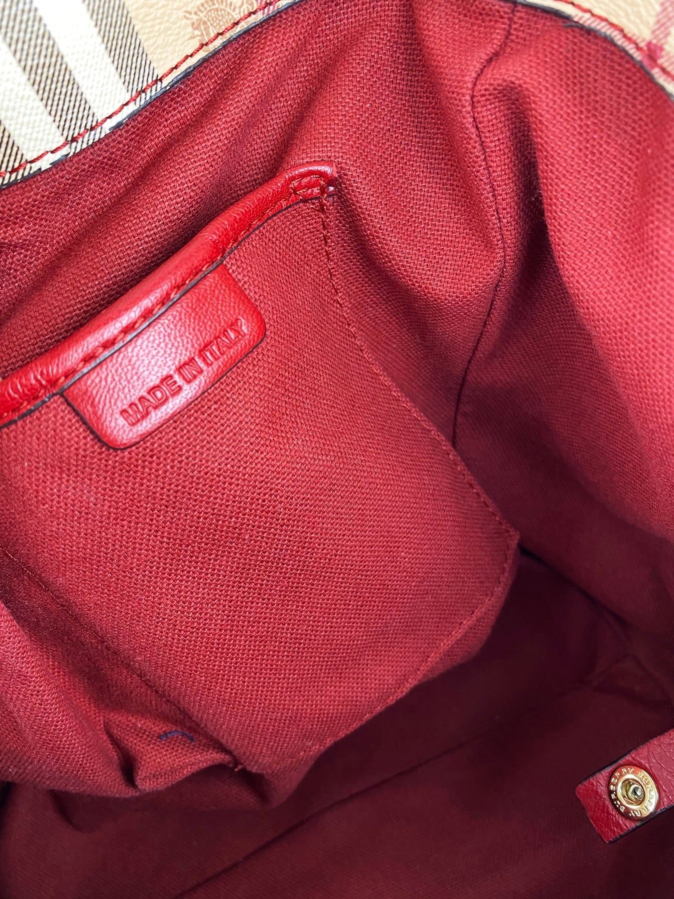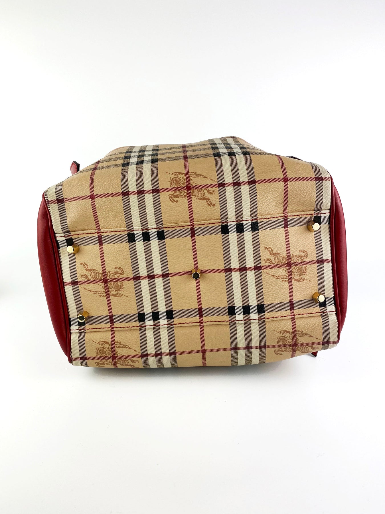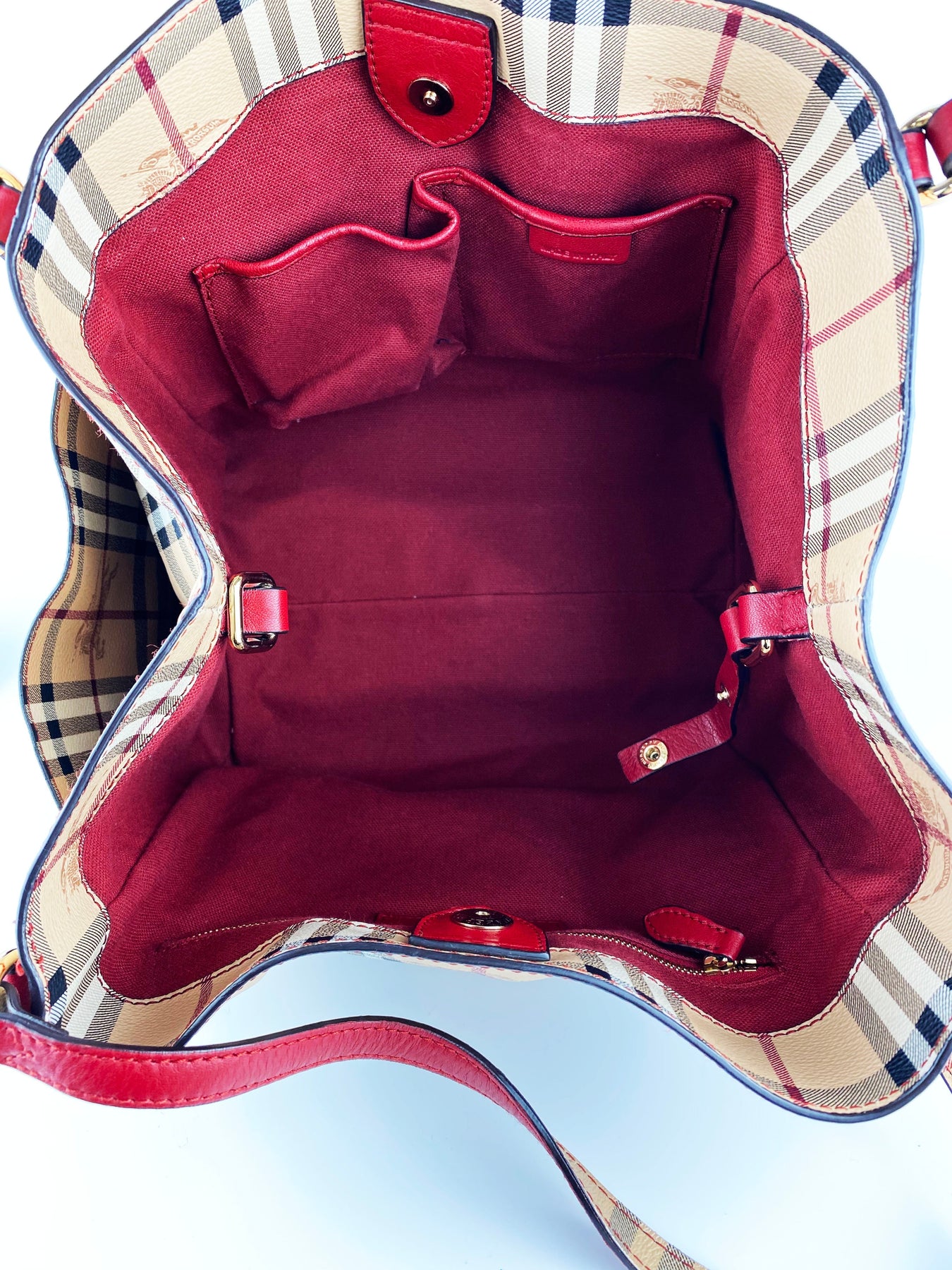 Description : Versatile bucket tote from Burberry in the house's signature check. Excellent condition; slight marks to canvas, some wear to handles