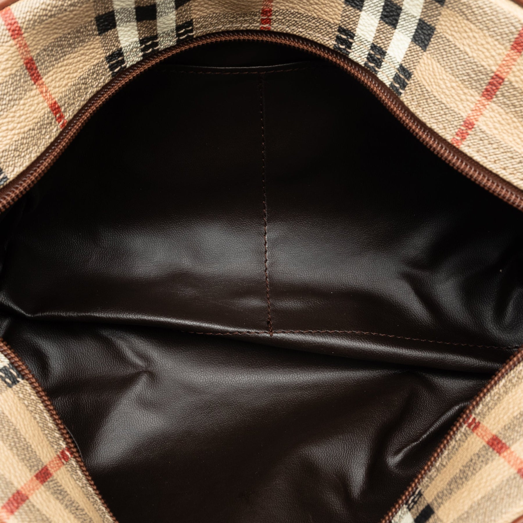 This clutch bag features a plaid coated canvas body with leather trim, a top zip closure, and a front exterior zip pocket.