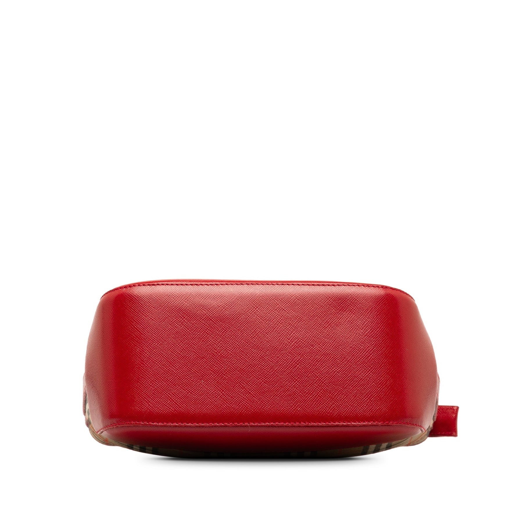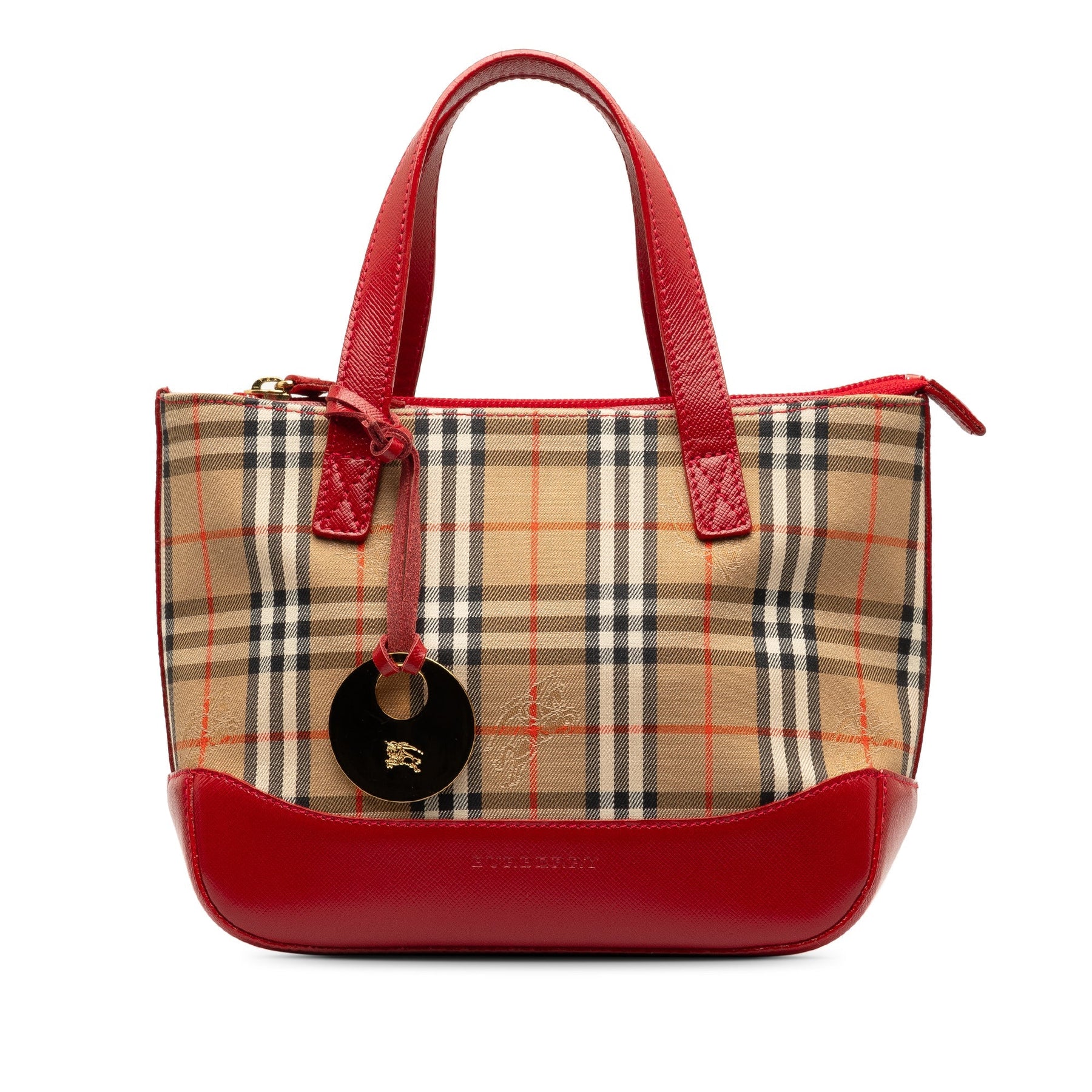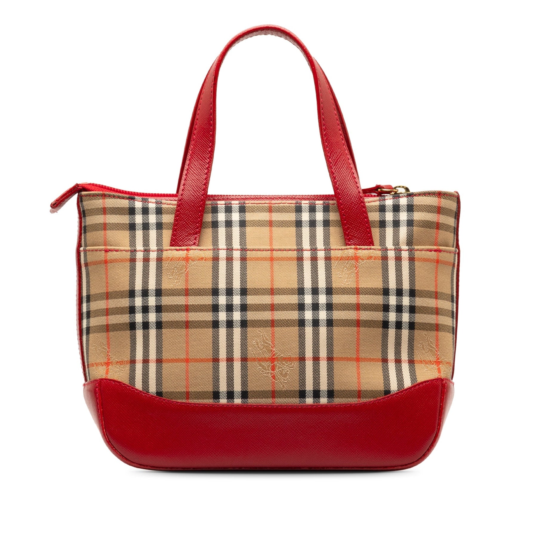 This handbag features a canvas body with leather trim, an exterior slip pocket, flat leather handles, a top zip closure, and interior zip and slip pockets.