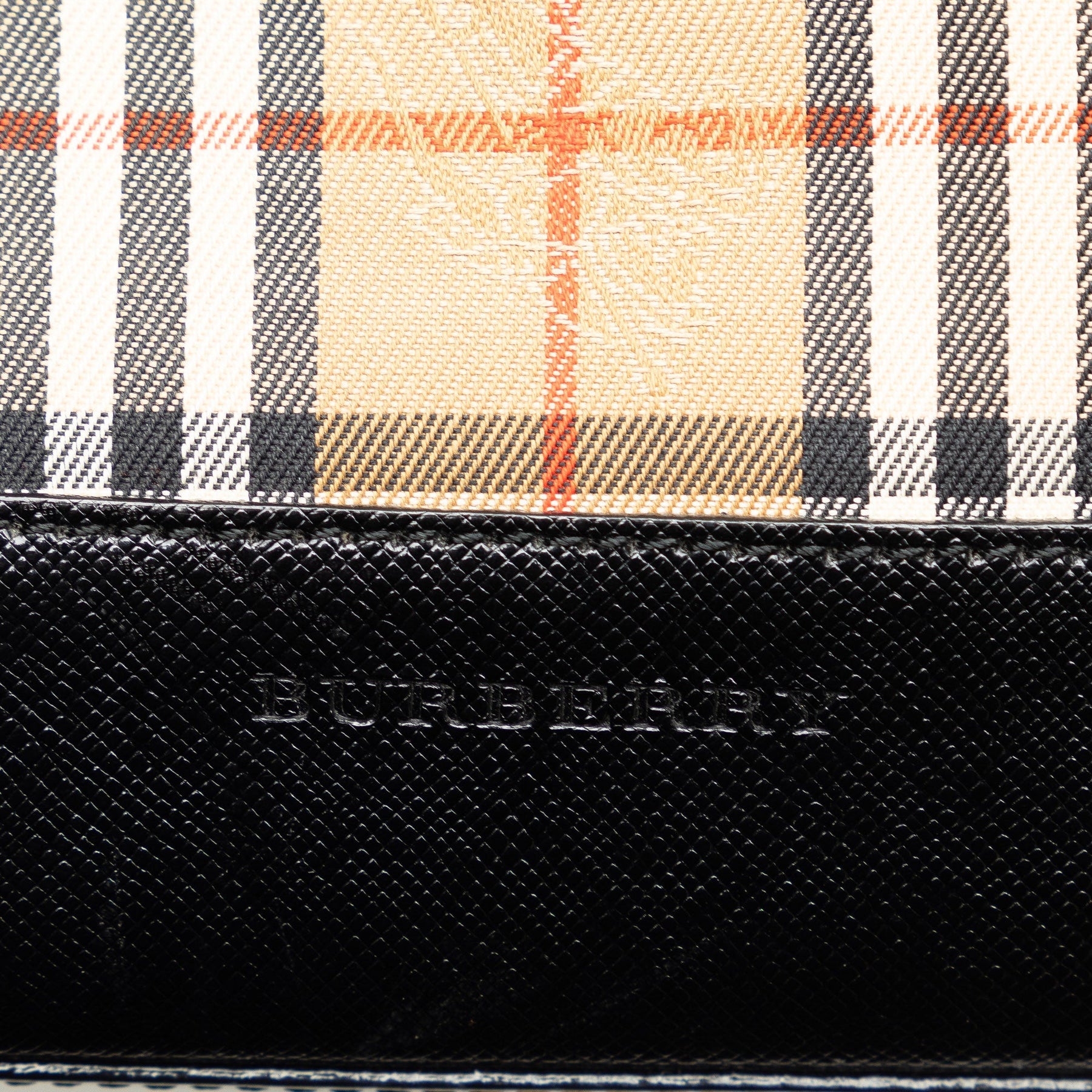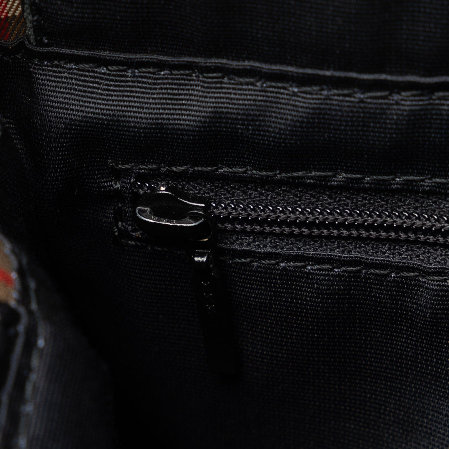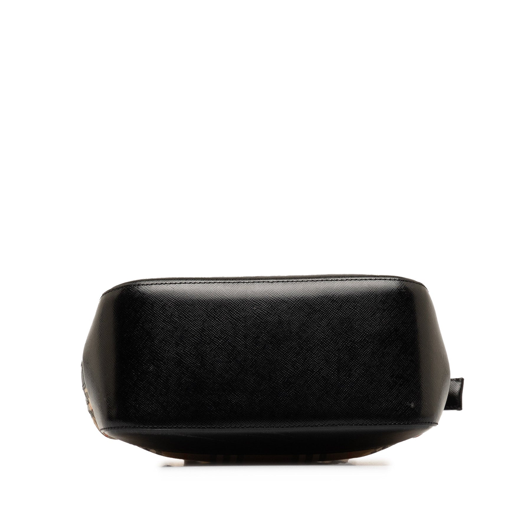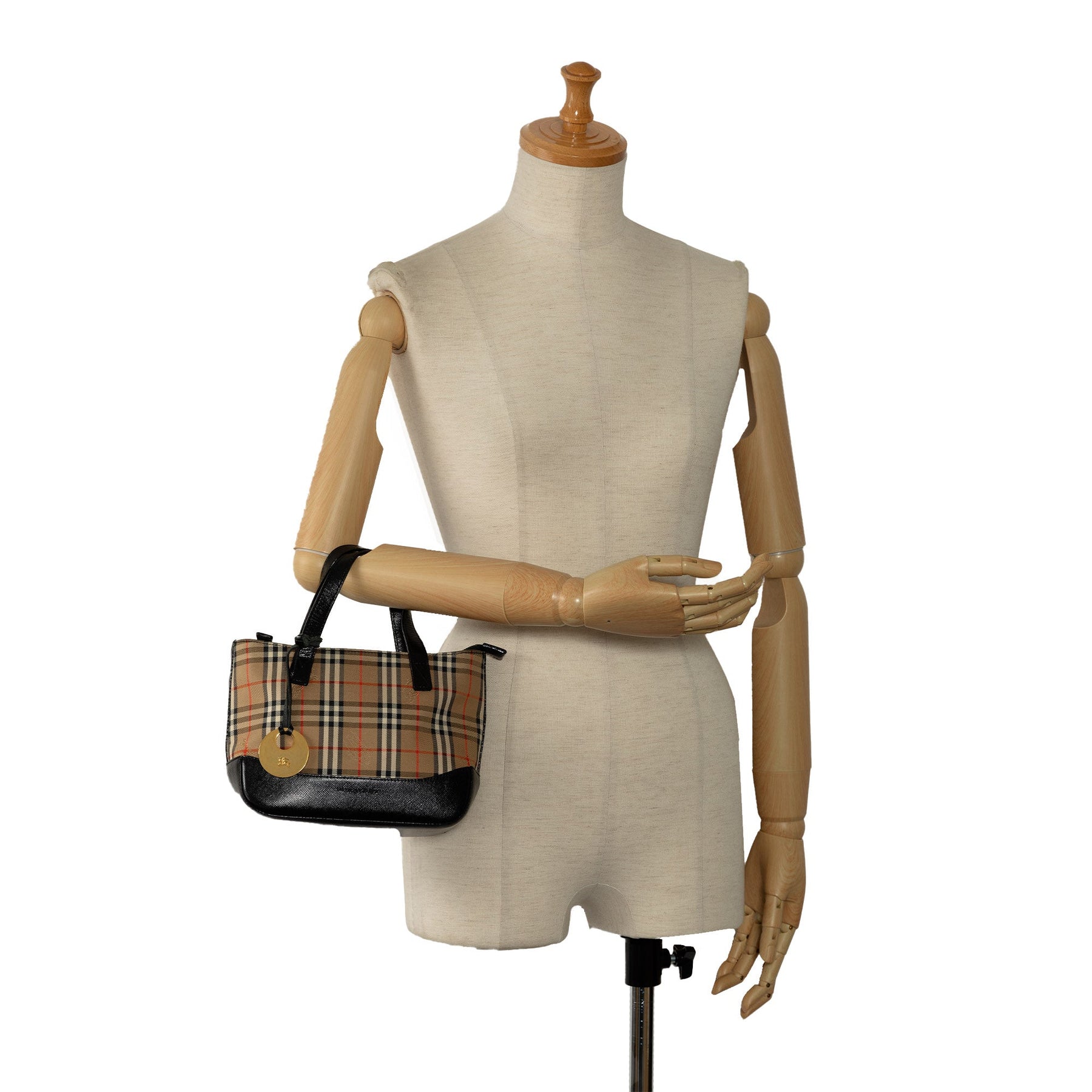 This handbag features a canvas body with leather trim, flat leather straps, a top zip closure, and interior zip and slip pockets.
