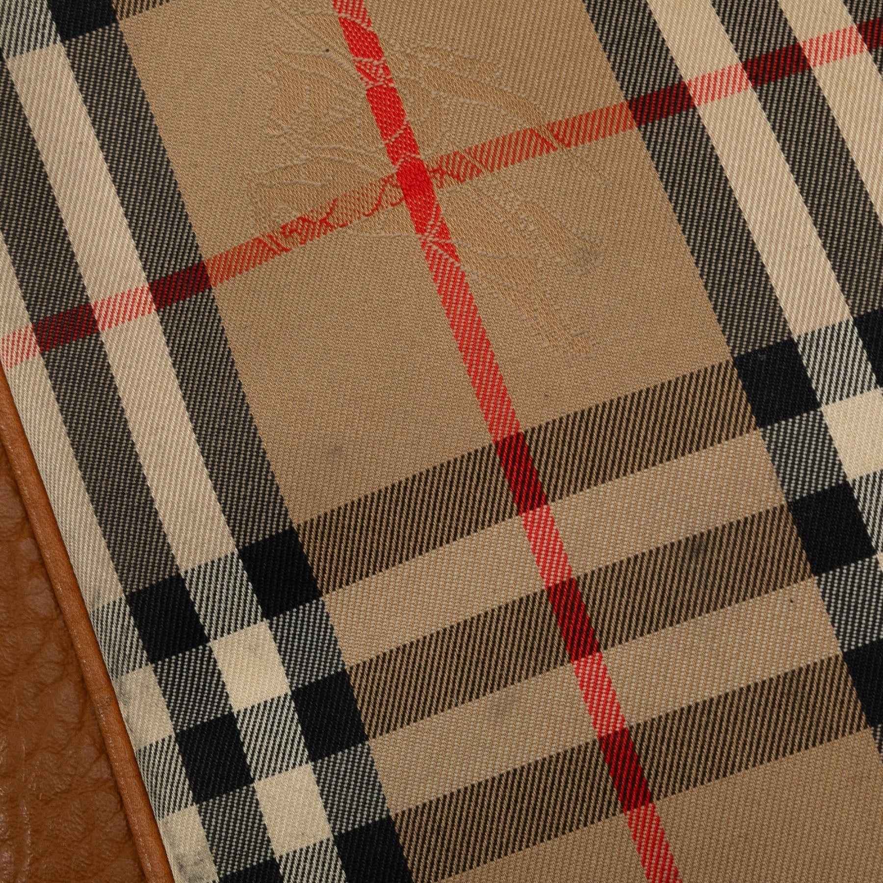 This handbag features a canvas body with leather trim, a flat leather handle, a top zip closure, and an exterior slip pocket.