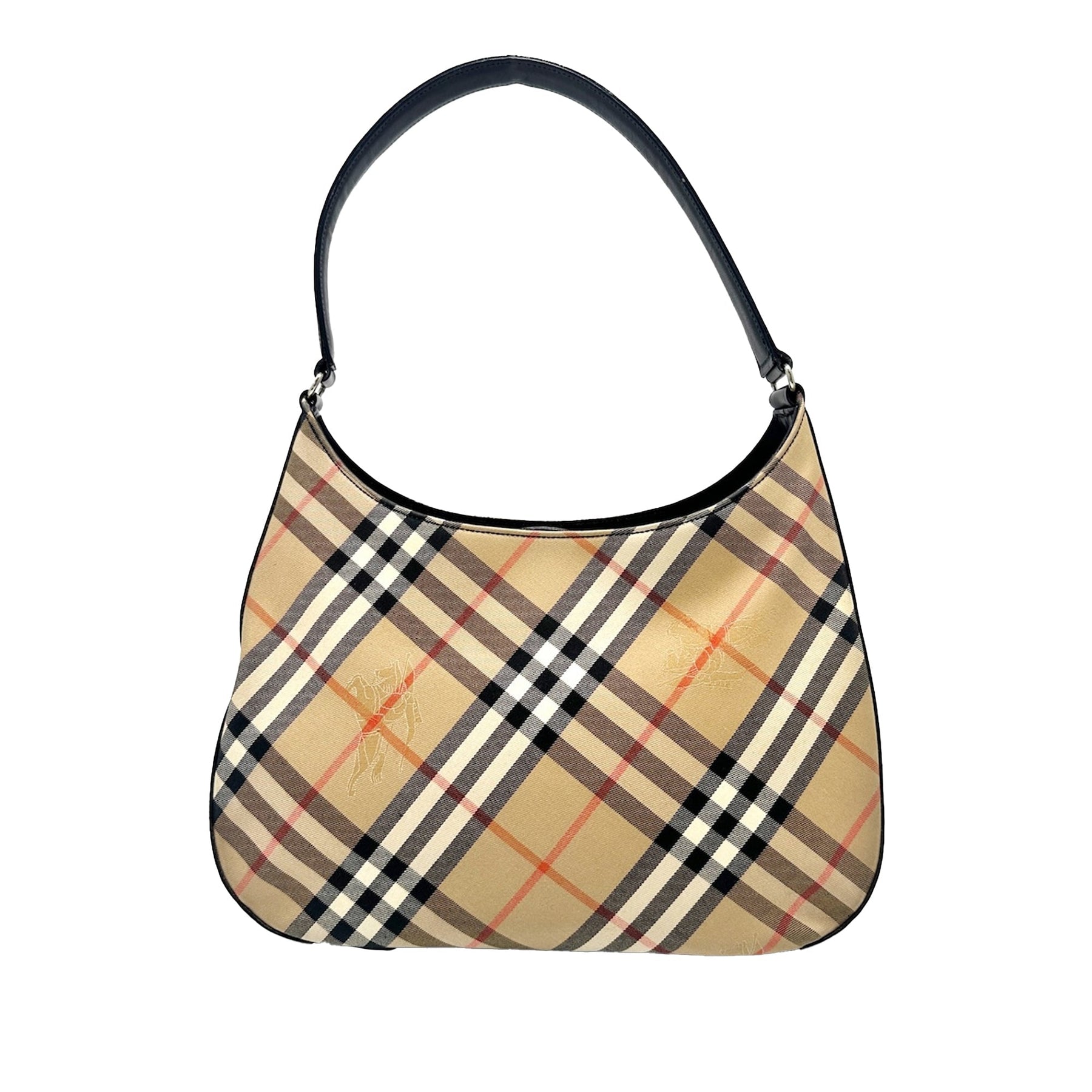 This shoulder bag features a canvas body with leather trim, a flat leather strap, a top strap with snap button closure, an exterior front pocket with a leather flap, and interior zip and slip pockets.
